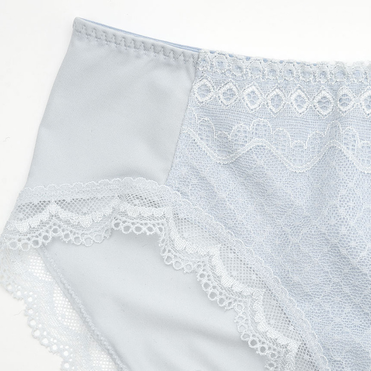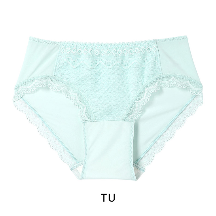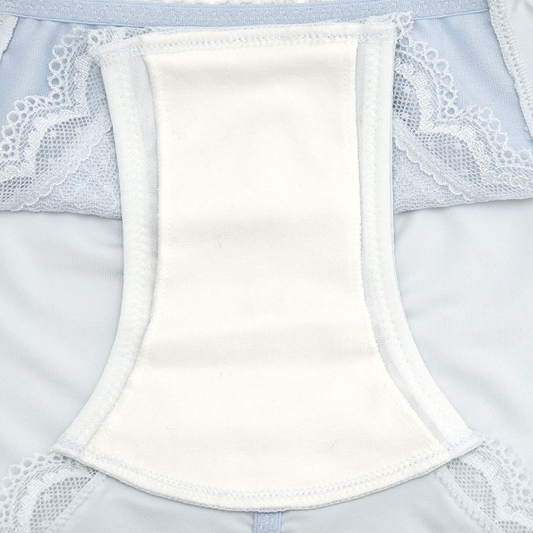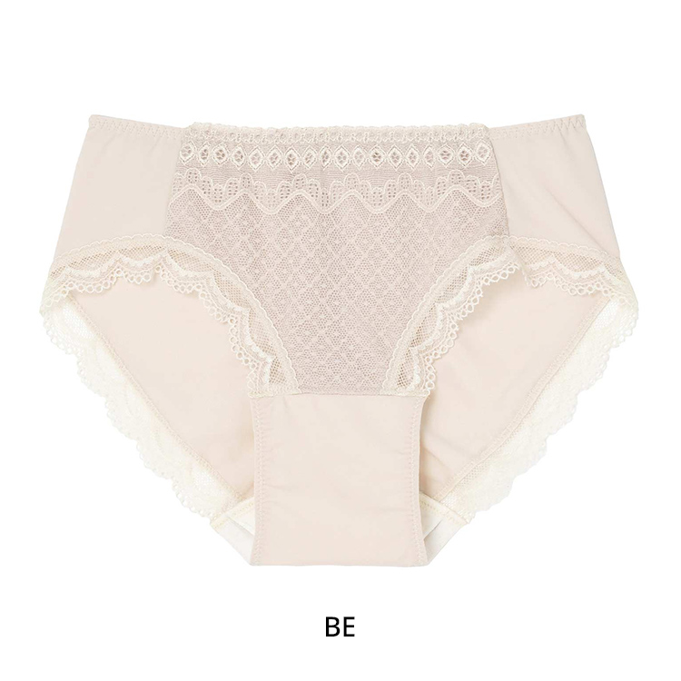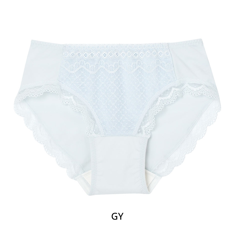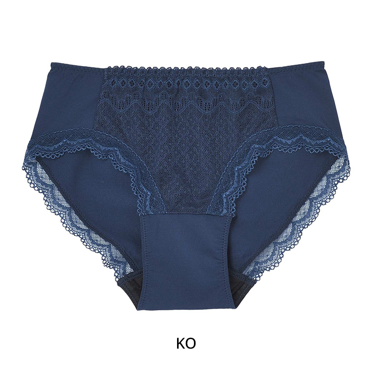 毎日のお洋服に合わせやすい、ミニマルなデザインのサニタリーショーツ。 幾何学模様のレースがかっこいいデザイン。表のレースと裏の素材のカラーを変えることにより、カラーの楽しさや奥行きを演出。後身頃には伸びのよい素材を使用しているので、やさしい肌ざわり。裾にはレースを使用しているので、アウターにひびきにくい。後中心のギャザーでおしりにフィットし、マチ部分はナプキンの羽をしまえる設計。表マチ肌側はテープを防水布で覆っているので汚れが落としやすく、横モレが気になりにくい。ウエストテープは高伸度のテープを使用しているので、やさしくフィット。 |