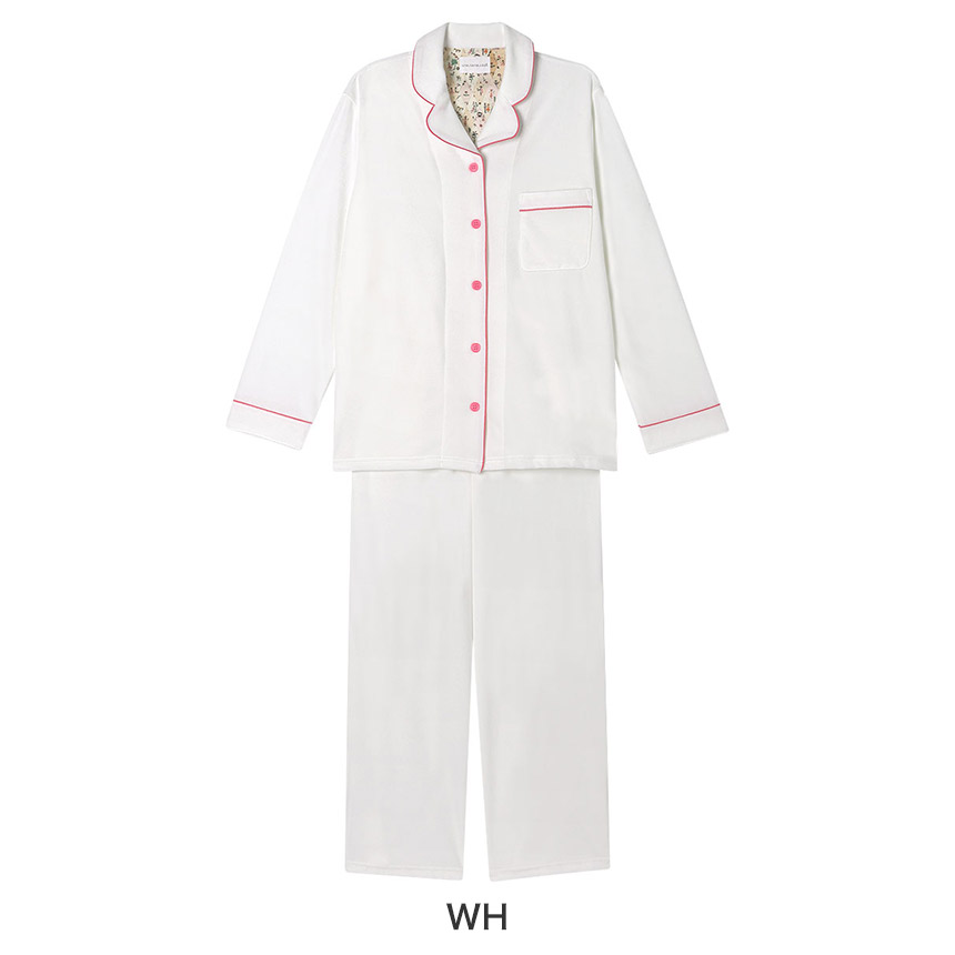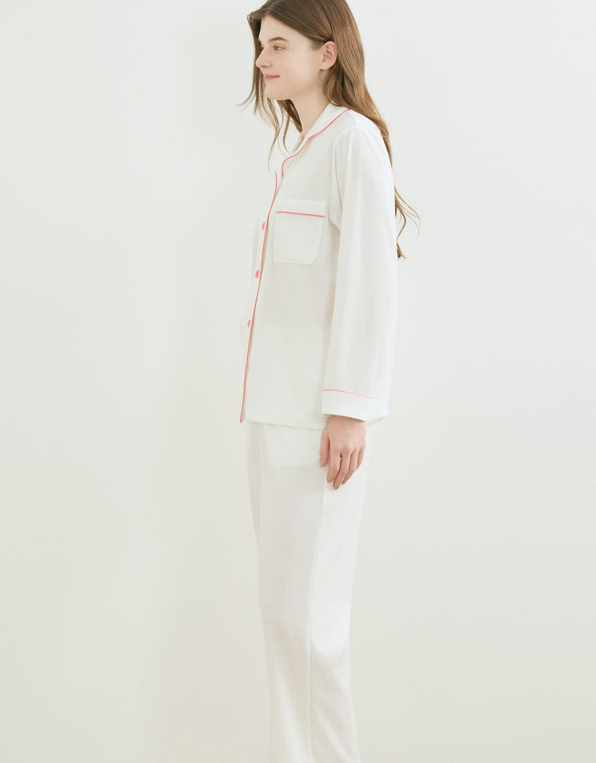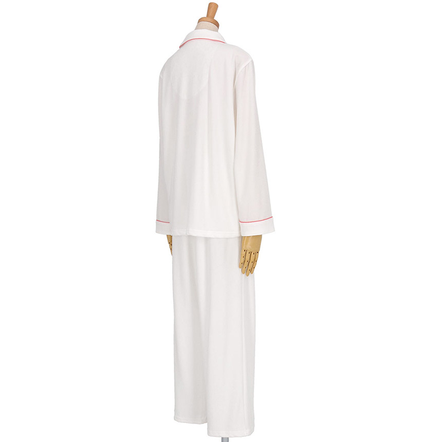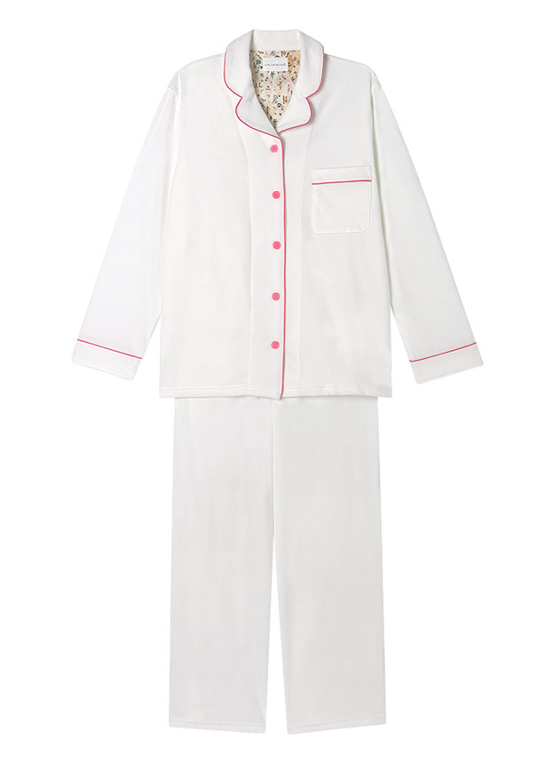 なめらかなパイル素材を使用した開襟シャツの長袖パジャマ。