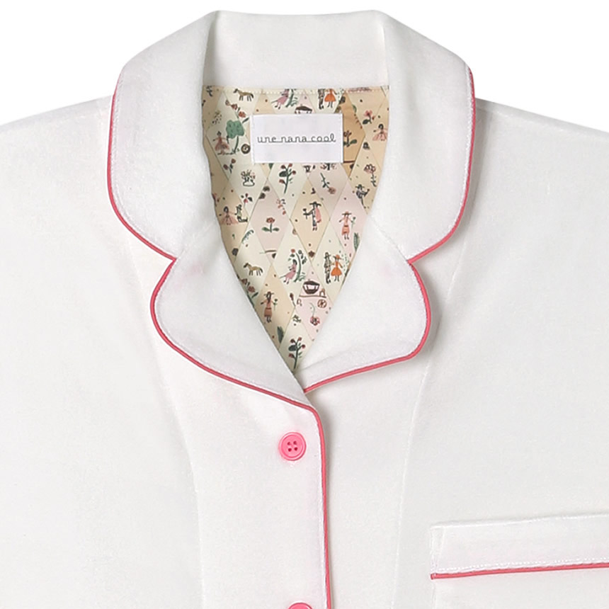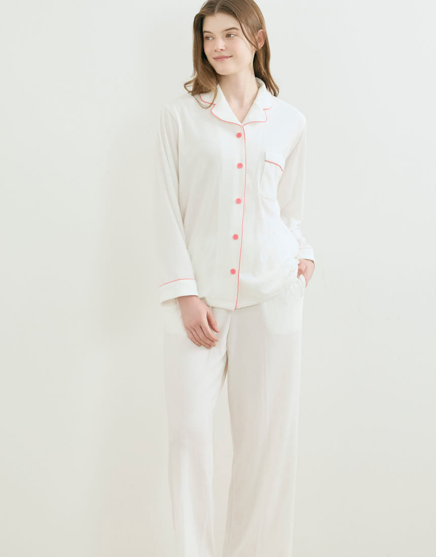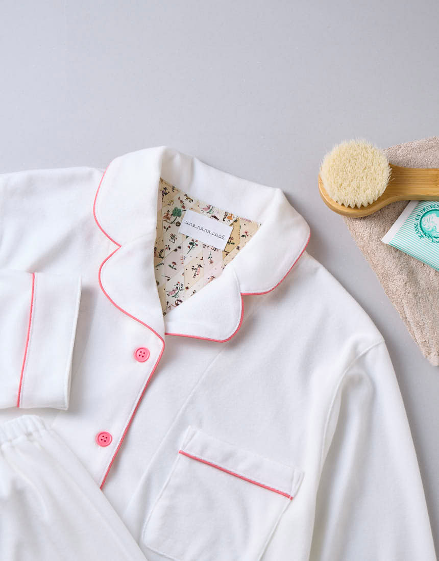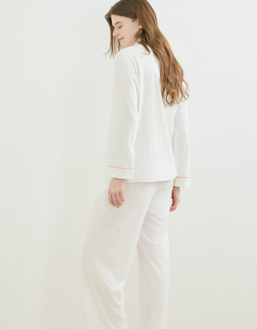 なめらかなパイル素材を使用した開襟シャツの長袖パジャマ。