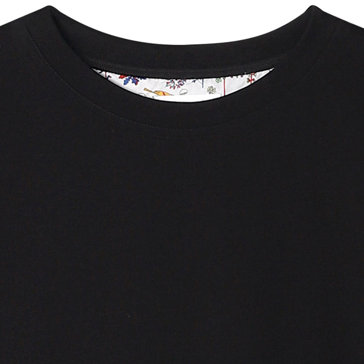表面はさらりとした肌あたりで手が入れやすいよう斜めに付けられたポケットと背当てのリバティプリントがデザインポイント。