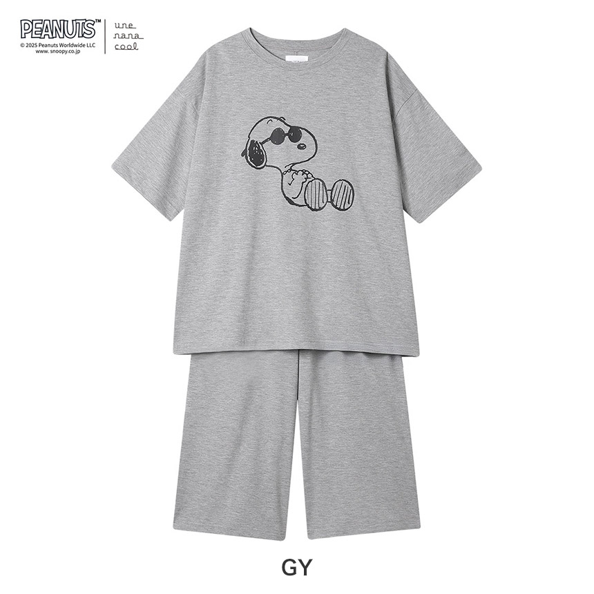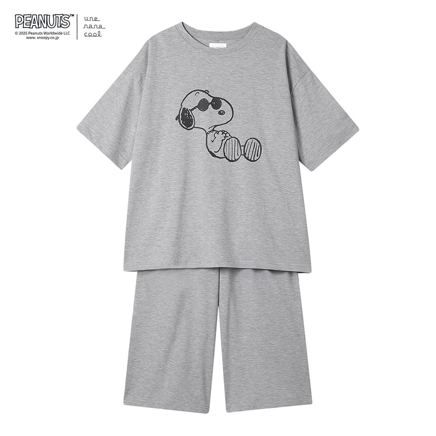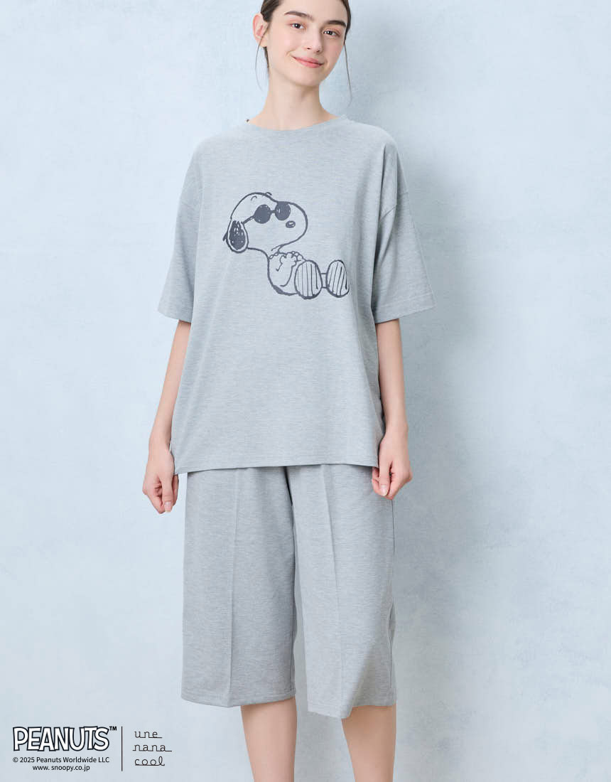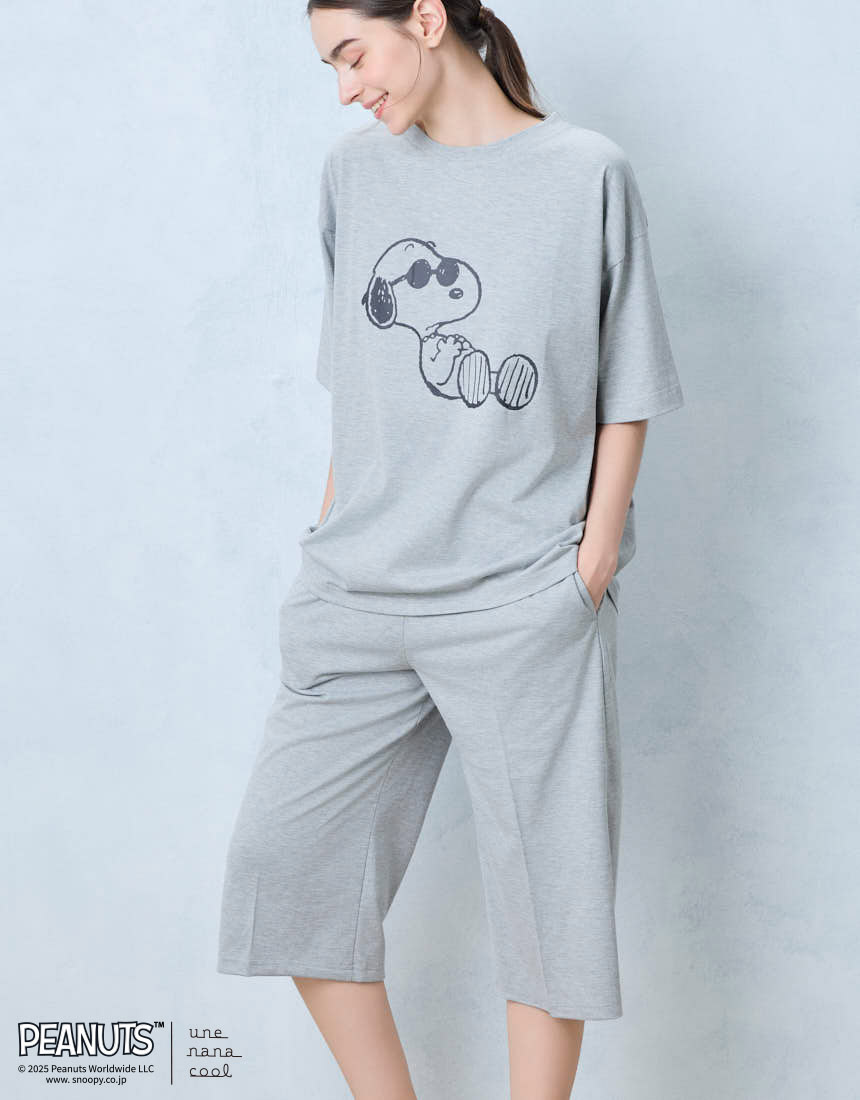 胸の部分には愛らしいスヌーピーと仲間たちを大胆にプリントしたオーバーサイズのゆったりとしたラフなシルエット。