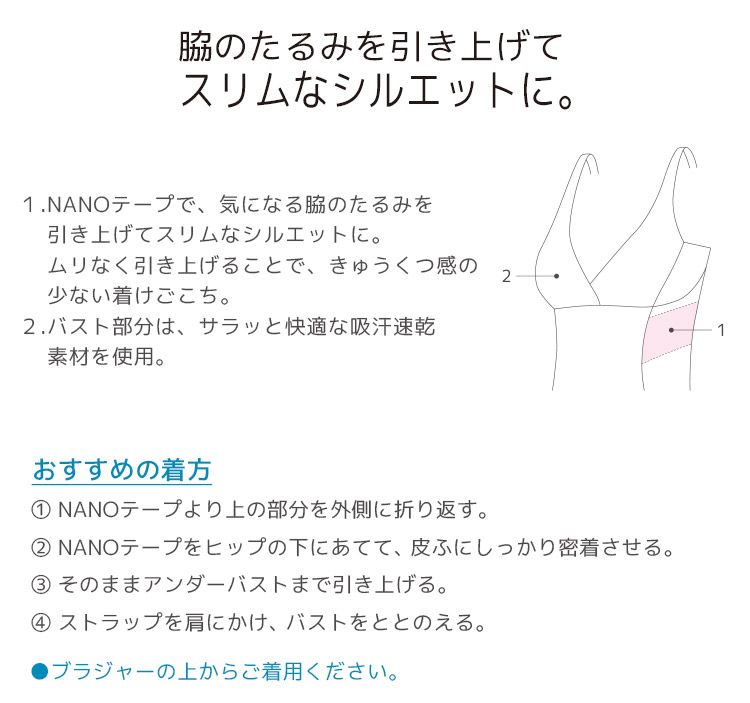 "すべりにくい""ソフトな肌ざわり"という特徴をもつ超極細繊維を使用した「NANOテープ」[特許 第5296901号]で、脇の"たるみ"を引き上げて、スムージング