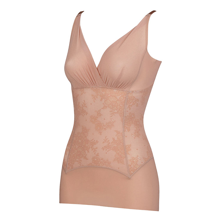 ・パワー切り替えのない素材で、おなか・脇腹・背中をスムージングし、きゅうくつ感の少ないつけごこちでスリムなシルエットに