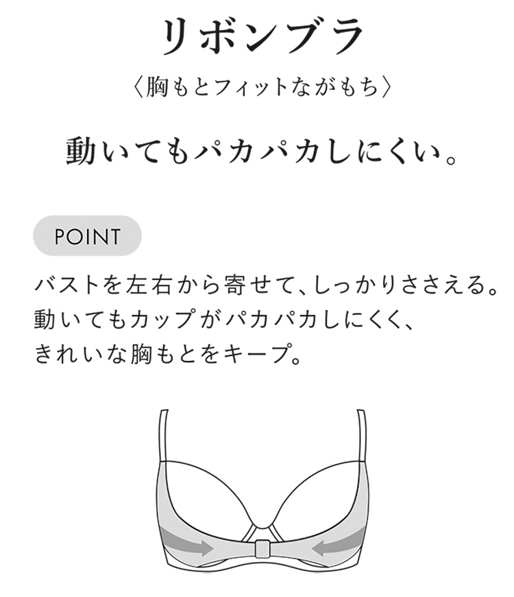 キープリボン構造で寄せたバストをしっかりささえて、動いても谷間をキープ