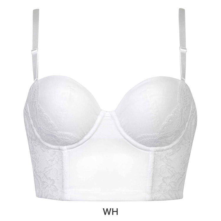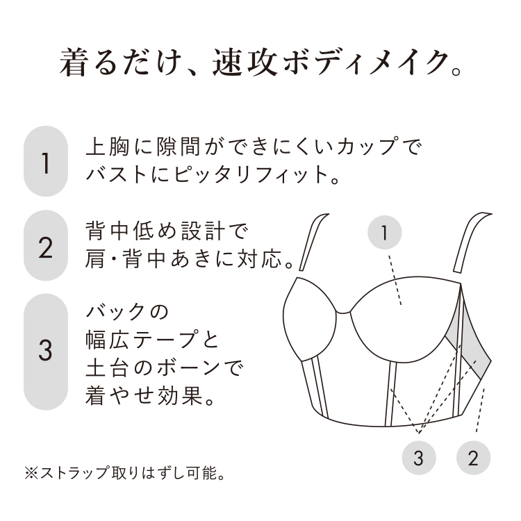 脇から背中にかけての幅広テープと土台や脇のボーンで安定感を高め、着やせ効果のある補整ブラ
