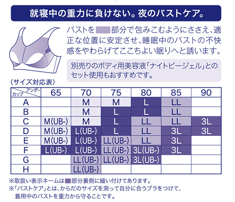 眠る時のバストを独自の構造で包みこむようにささえ、適正な位置に安定させることで、睡眠中のバストの不快感をやわらげて、ここちよい眠りへと誘う就寝時用ブラジャー