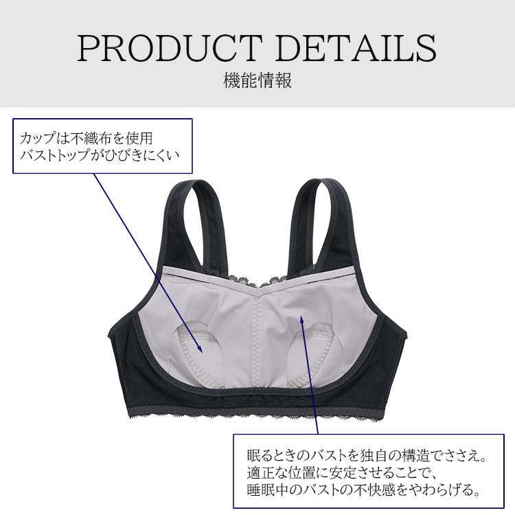 眠るときのバストを独自の構造で包みこむようにささえ、適正な位置に安定させることで、睡眠中のバストの不快感をやわらげて、ここちよい眠りへと誘う就寝時用ブラジャー