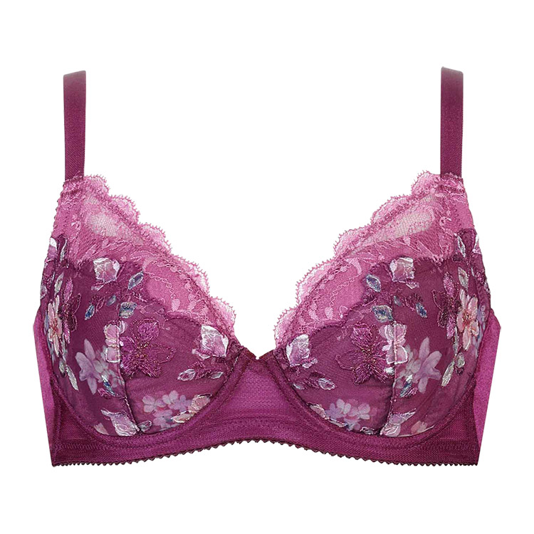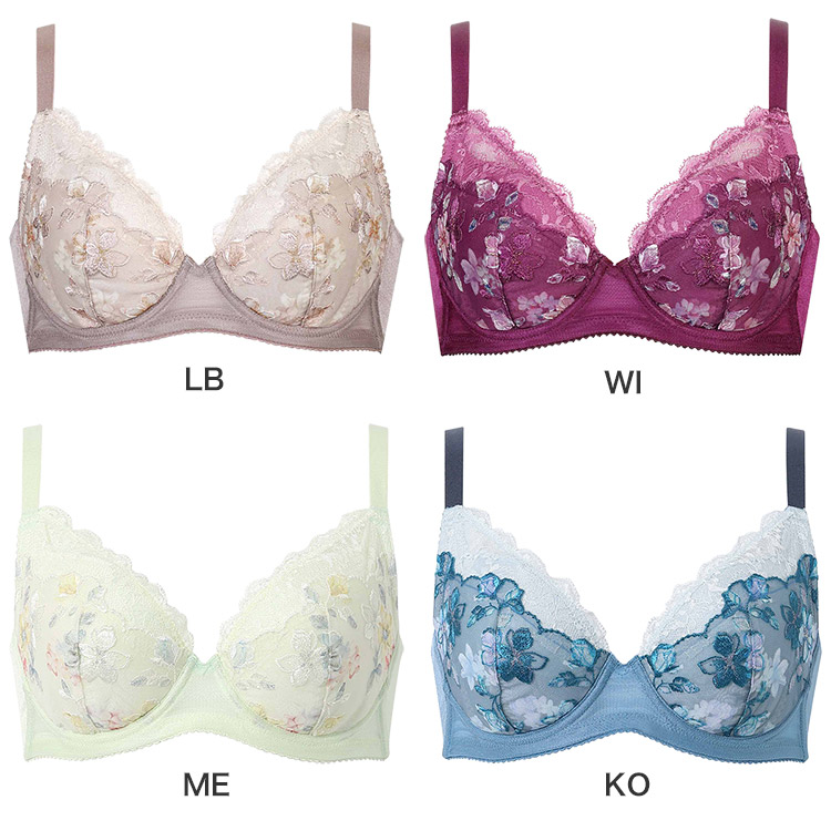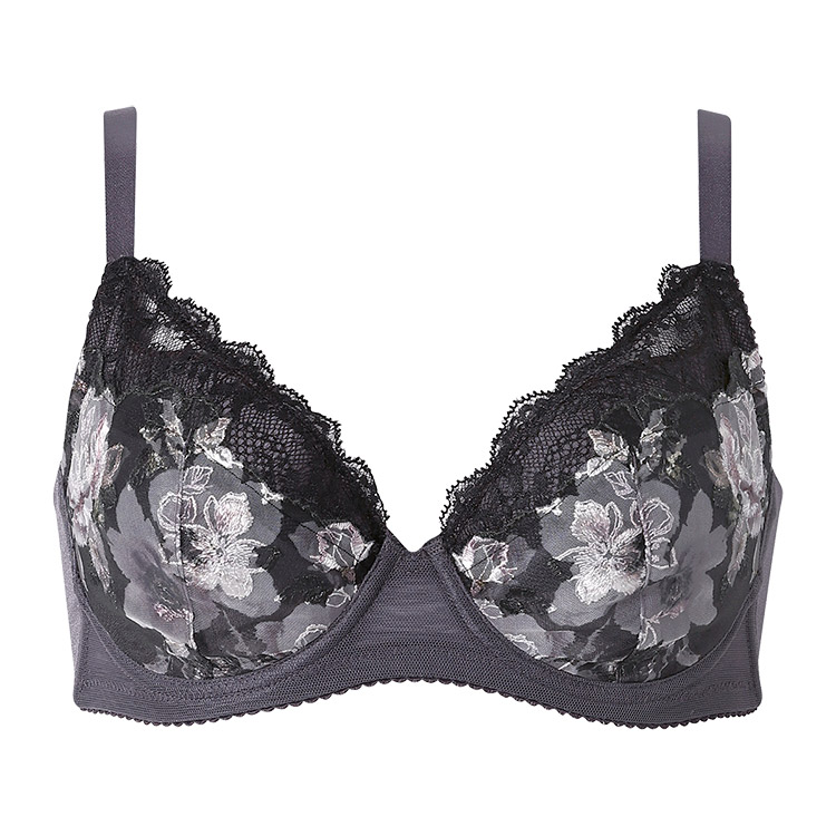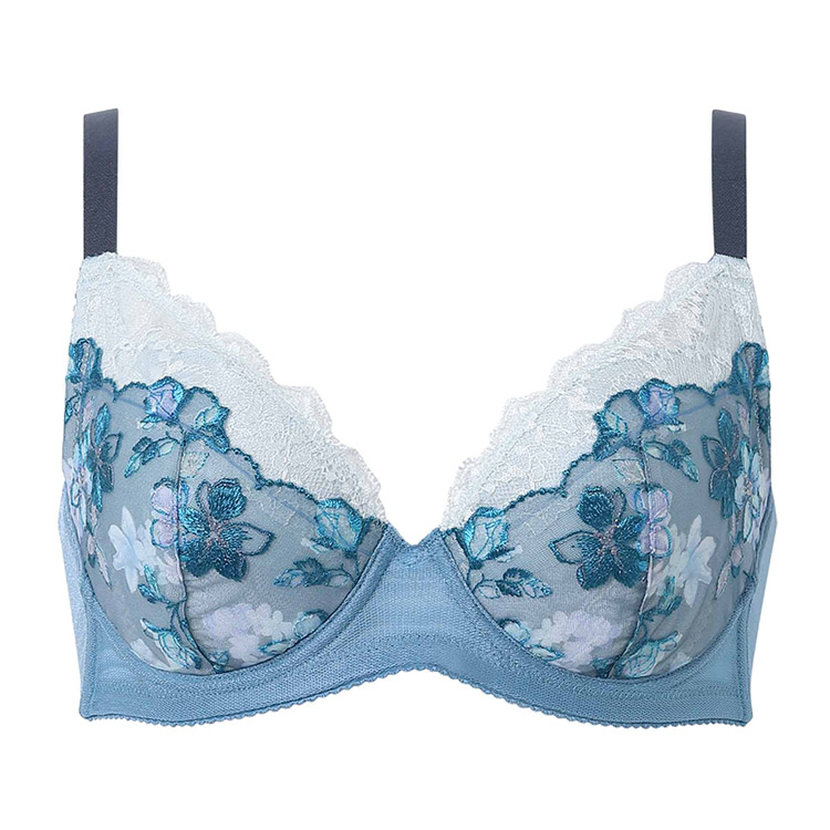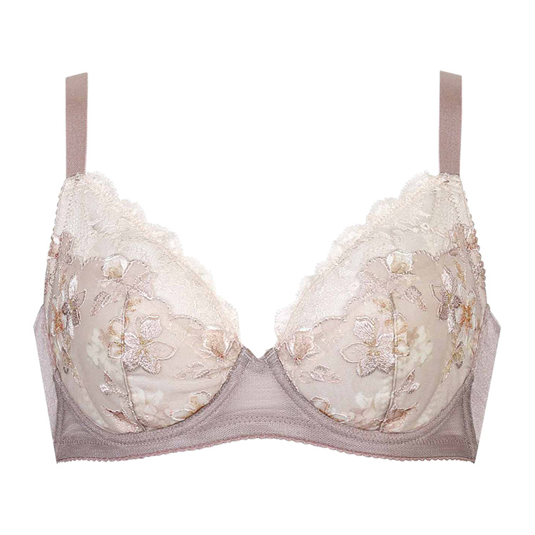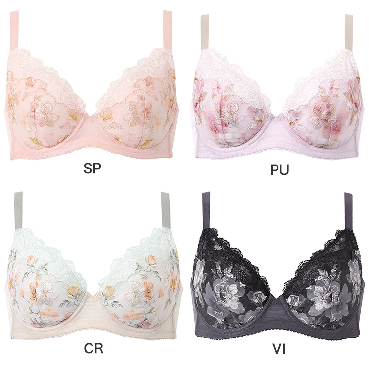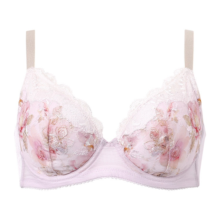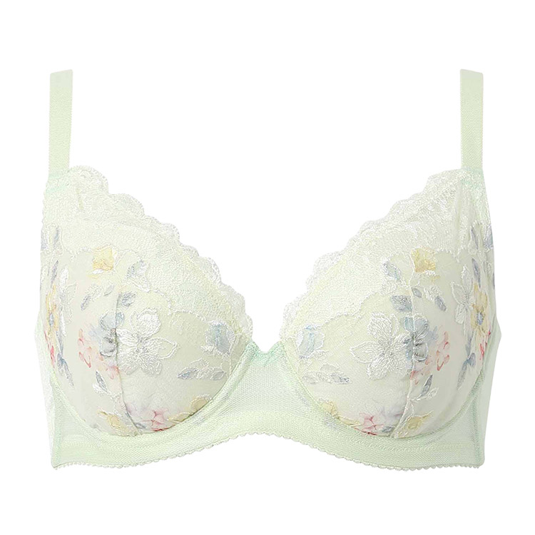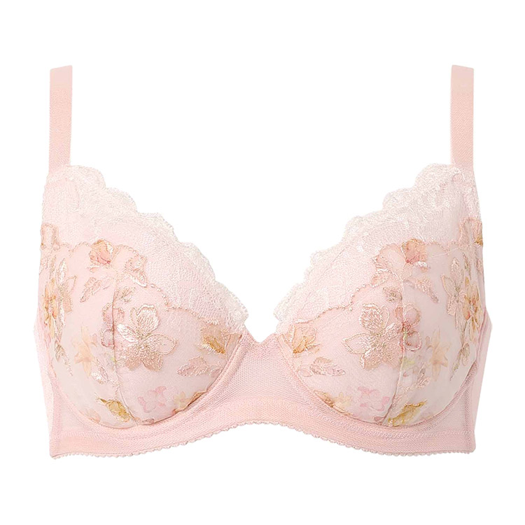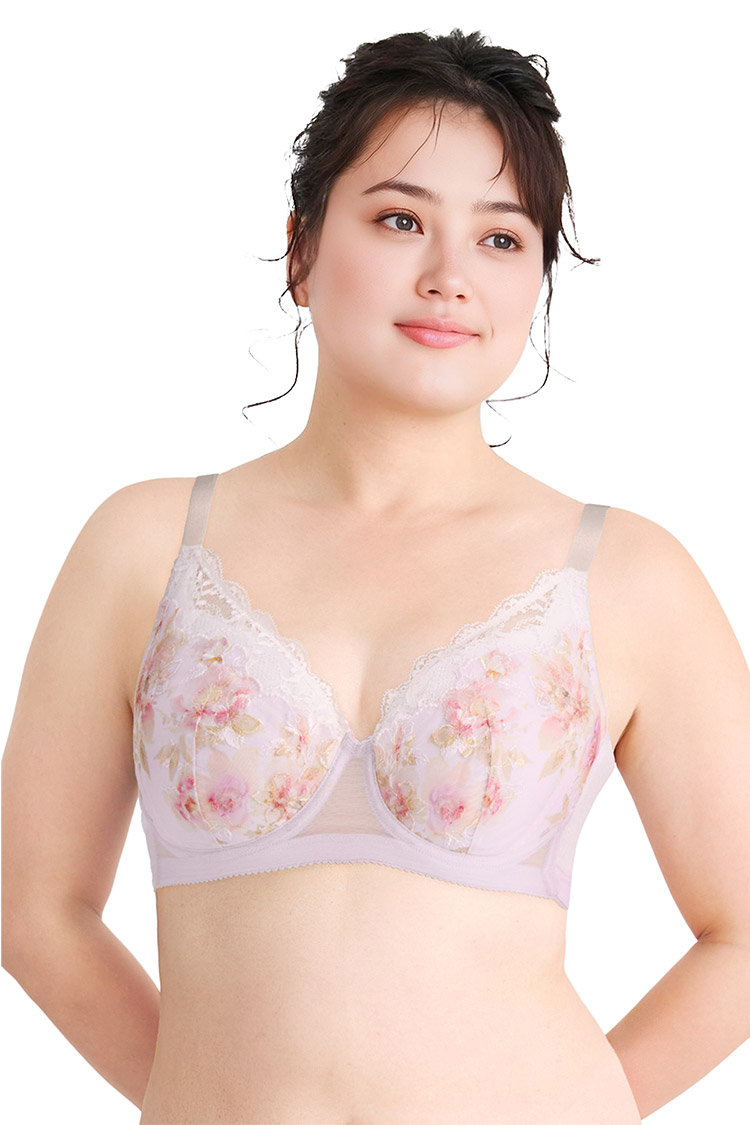 ボリュームのあるバストの高さを抑えコンパクトにまとめるので、薄手のシャツやブラウス、ニットなどをすっきり着こなしたいときにおすすめ。可憐な花々をモチーフにしたレースが愛らしいロマンティックなデザインです。