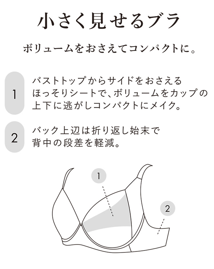 バストの高さを抑えて、トップの周径を効率的に減らすことで着やせ効果のあるブラジャー