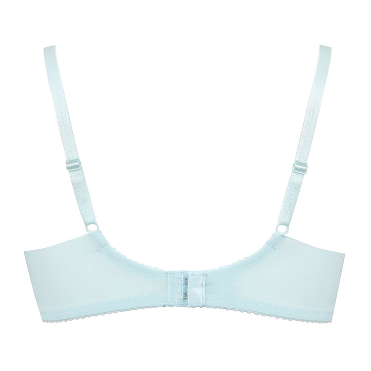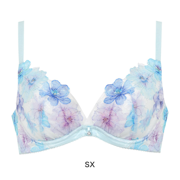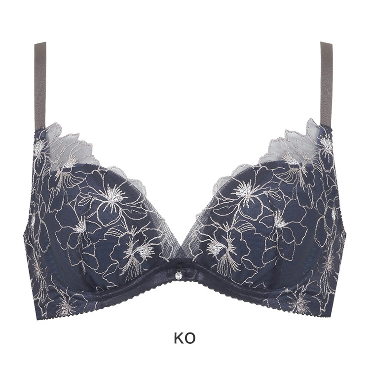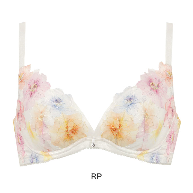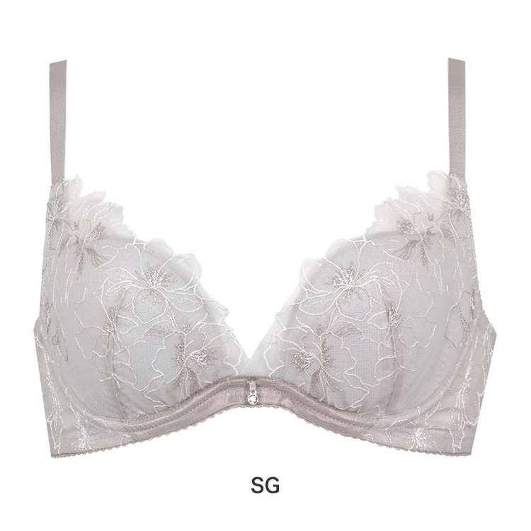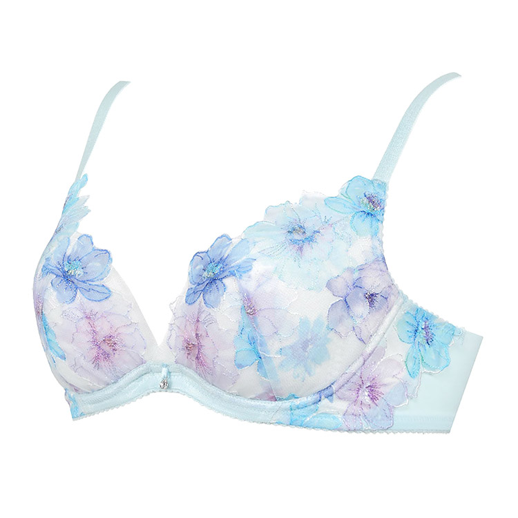 胸もとの圧迫感を軽減した解放感のあるカップスタイル。前中心は低く、脇は高いワイヤーで圧迫感を軽減しながらすっきりとホールド