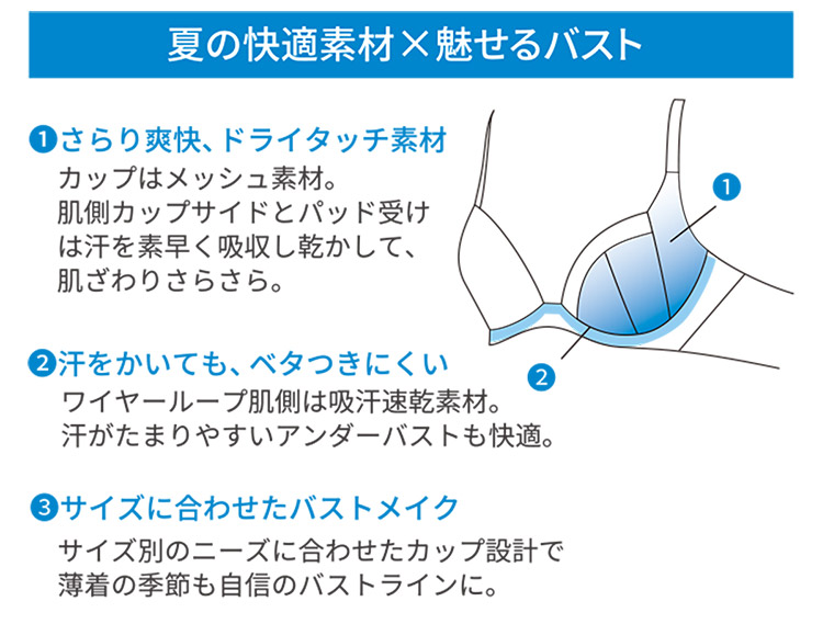 カップはメッシュ素材。肌側カップサイドとパッド受けは吸汗速乾性にすぐれたドライタッチ素材で汗をすばやく吸い拡散、乾燥することで、さらり爽快