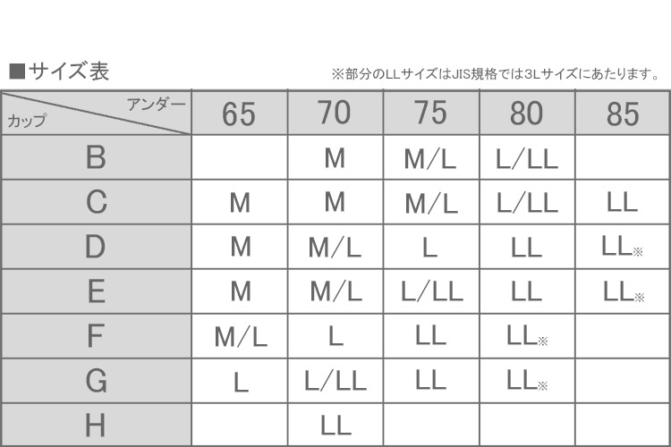 M(バスト79-87cm)、L(バスト86-94cm)、LL(バスト93-101cm)
