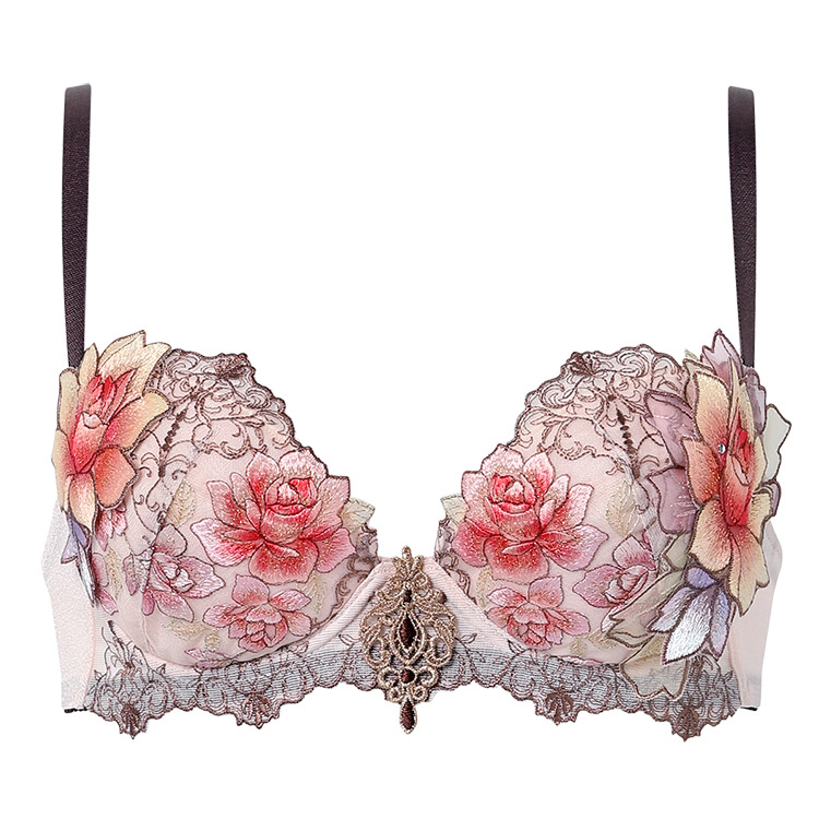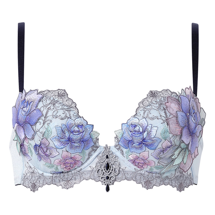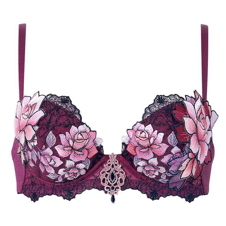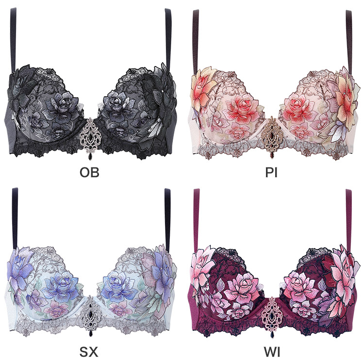 しなやかな曲線と美しい色彩の調和がエレガント。左カップにあしらわれた存在感のあるアップリケには、雫のようにきらめくスワロフスキー・クリスタルを飾りました。繊細なグラデーションで彩られた2つの大胆なバラが、オリエンタルなムードが漂うレースの魅力を引き立てます。前中心のクラシカルなモチーフは上品なアクセントに。統一感のあるカラーリングで、洗練された美しさを表現しました。