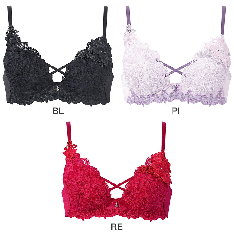 バラの花をイメージした存在感のある左カップのアップリケには、きらめくスワロフスキー・クリスタルをあしらいました。