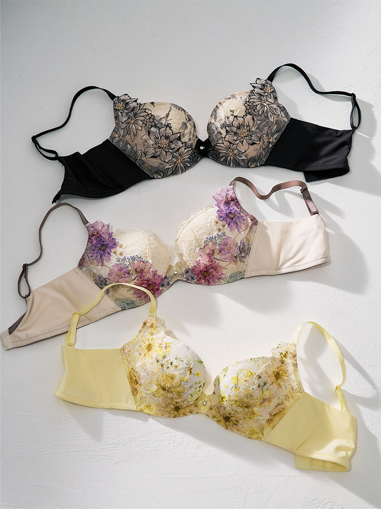 「ラクにつけたいけど、バストラインもメイクしたい」という方におすすめです。リフティングレースがバストをギュッと抱き寄せ、脇高設計と上辺折り返し始末でハミ肉や段差を軽減し、気になる背中も美しいシルエットに。デコルテのあいたお洋服やボディラインが出やすいピタッとしたファッションをきれいに着こなせます。表情豊かな花々が咲くフラワーガーデンを表現した、スウィートな気分に浸れるデザインもポイントです。