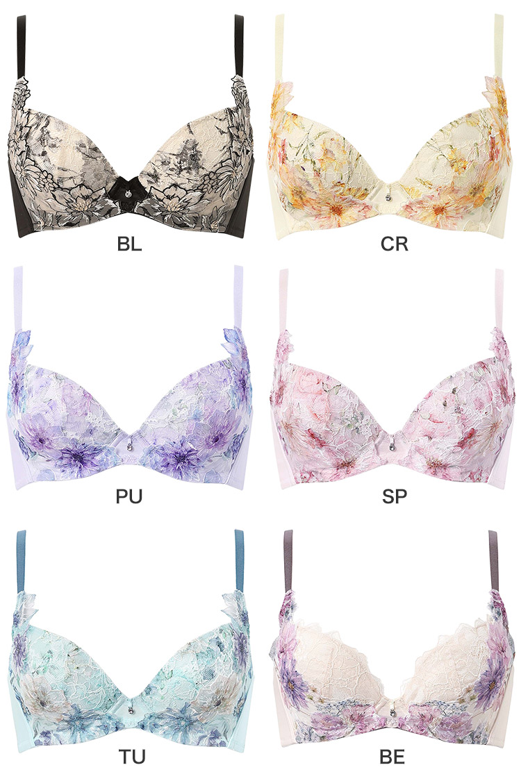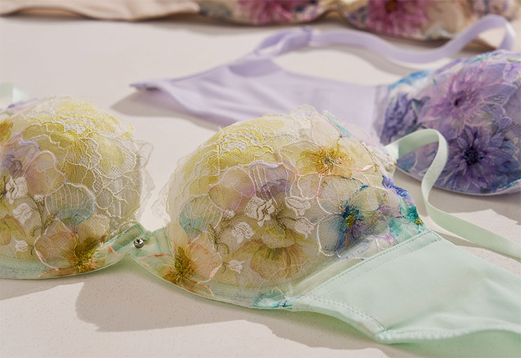 リフティングレースがバストをギュッと抱き寄せ、脇高設計と上辺折り返し始末でハミ肉や段差を軽減し、気になる背中も美しいシルエットに。
