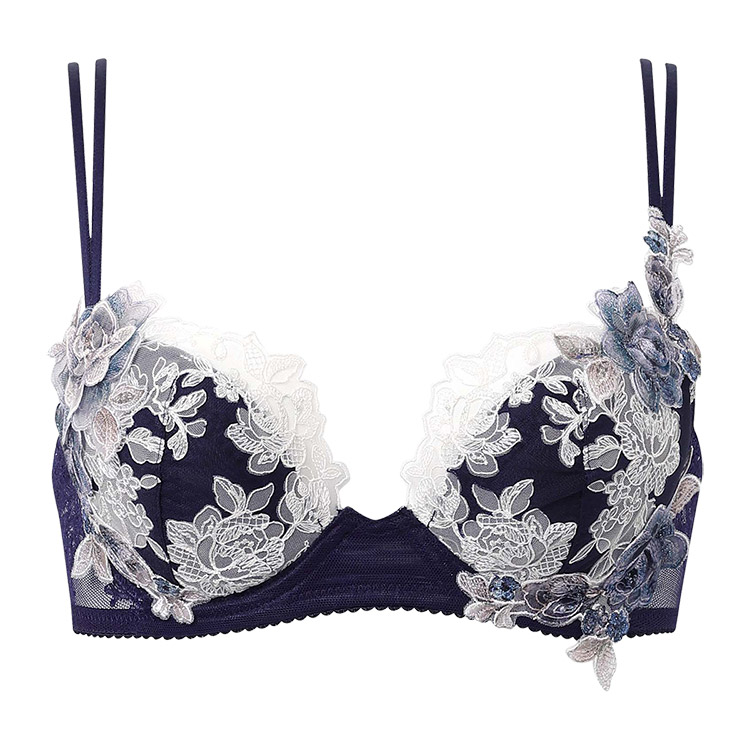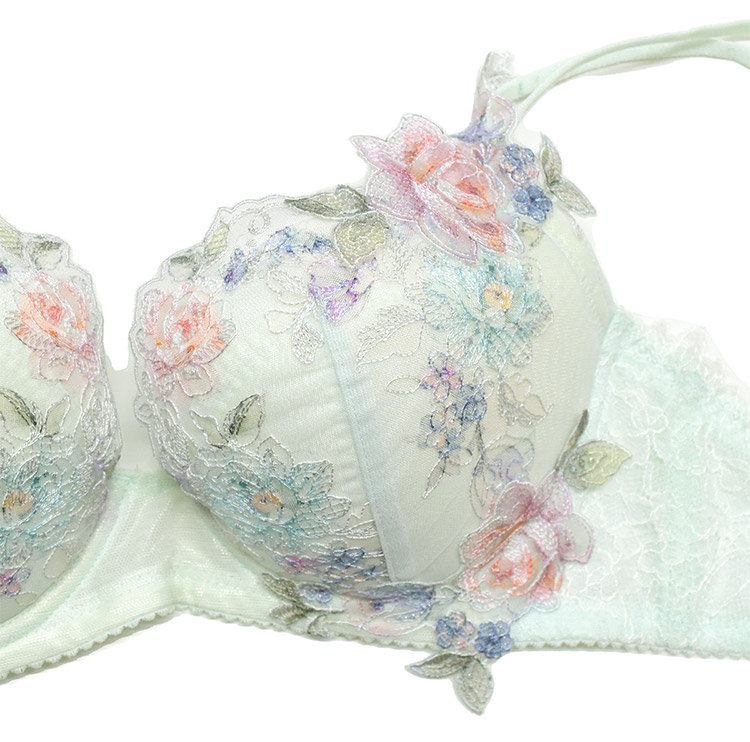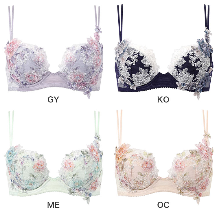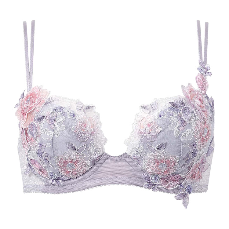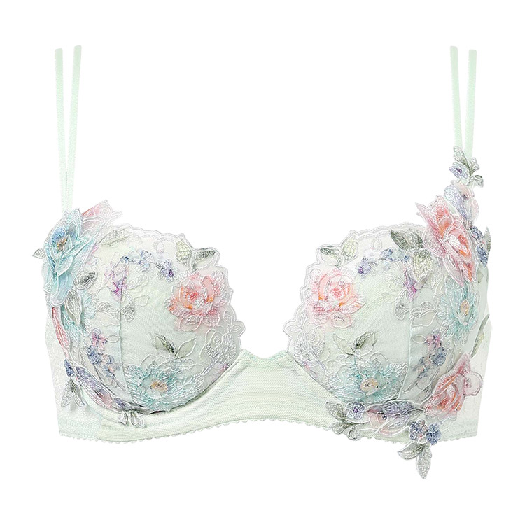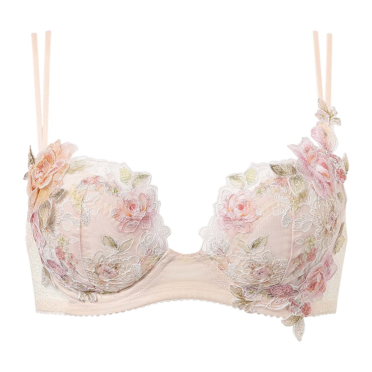 カップレースには繊細に輝くラメ糸を散りばめ、華やかなアップリケをふんだんにあしらった優雅で贅沢なデザイン。