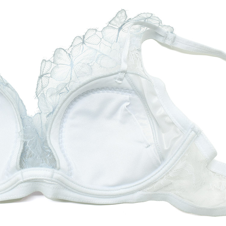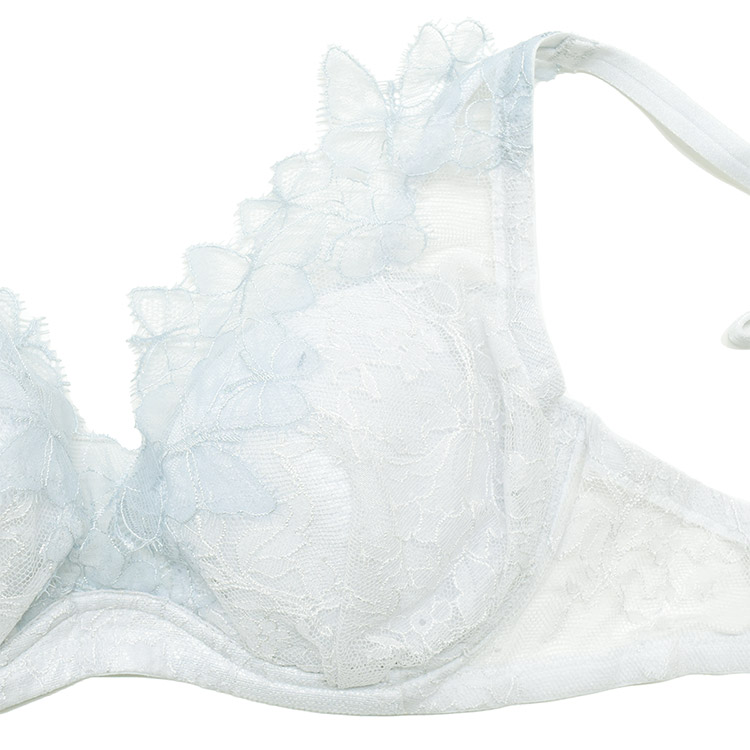 前中心の低いL字ワイヤーを使用し、フロント部分の圧迫とバックのしめつけ感が少ない軽やかな着用感