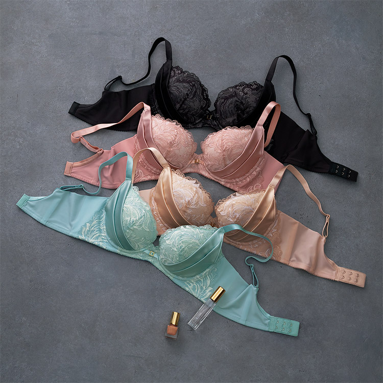 ・大胆なリーフモチーフを、繊細なリバーレースで詩的に美しく表現したモダンなデザイン。カップサイドにあしらったサテンパーツの光沢感がポイント