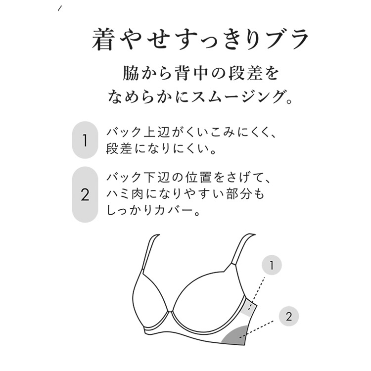 バック下辺の位置を下げることでブラをつけたときに気になる、脇から背中の段差をおさえ、なめらかに