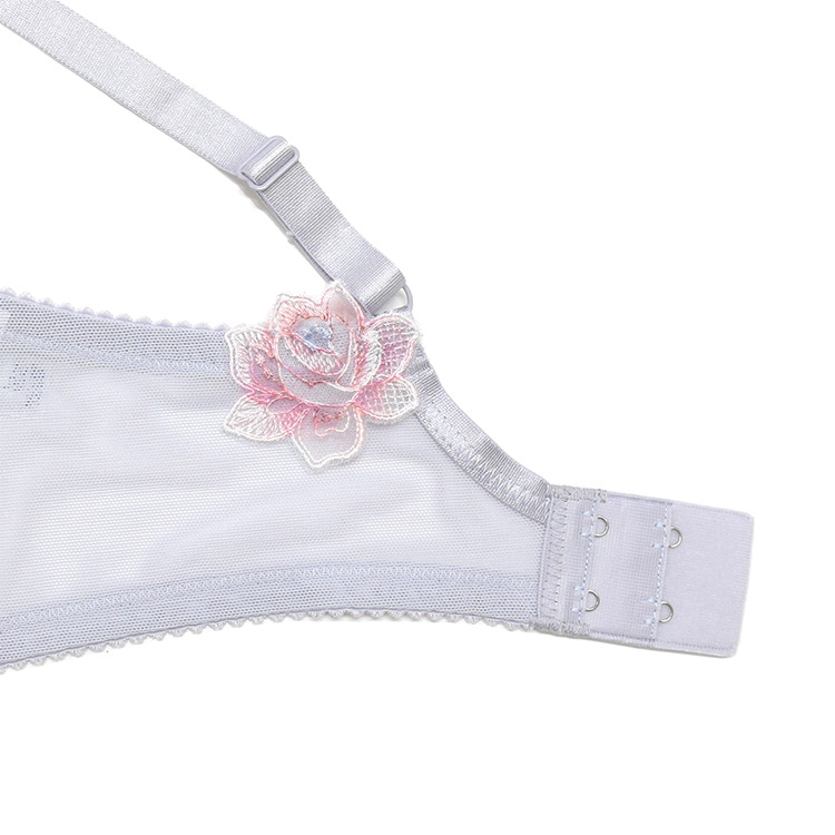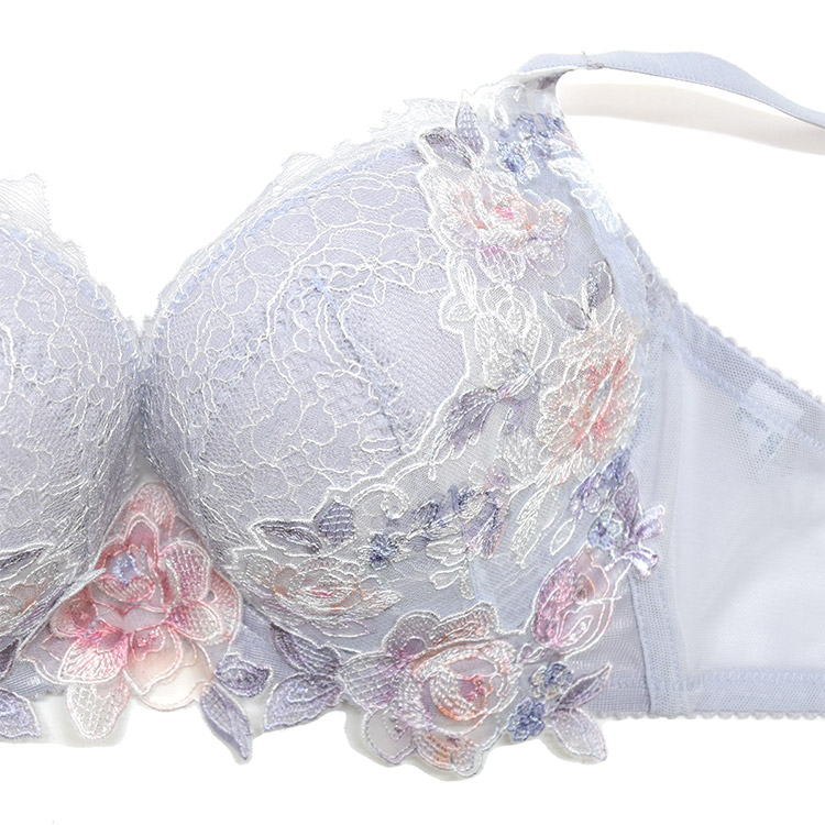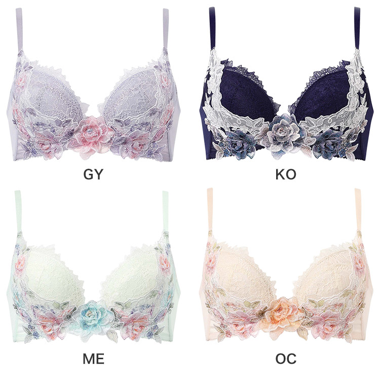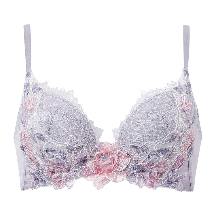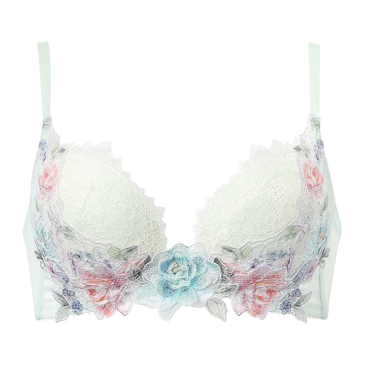 カップ脇のレースには繊細に輝くラメ糸を散りばめ、アップリケをふんだんにあしらった優雅で贅沢なデザイン。
