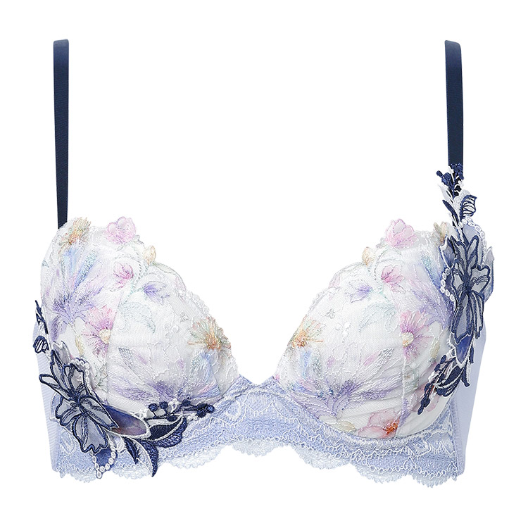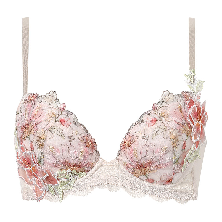 カップレースには繊細に輝くラメ糸を散りばめ、カップサイドに大きなアップリケを大胆にあしらったデザイン。アップリケは透け感があり、軽やかで春らしい印象です。バックにさりげなくほどこされたアップリケがアクセントに。高造形タイプで、「バストが広がって見えるのが気になる」「しっかり高さのあるメリハリバストが好み」という方におすすめです。