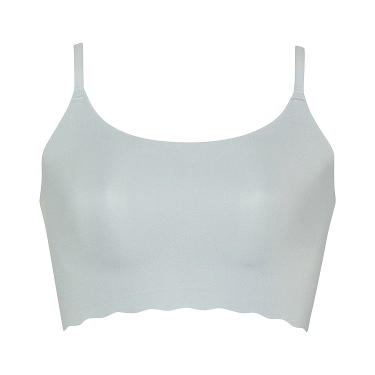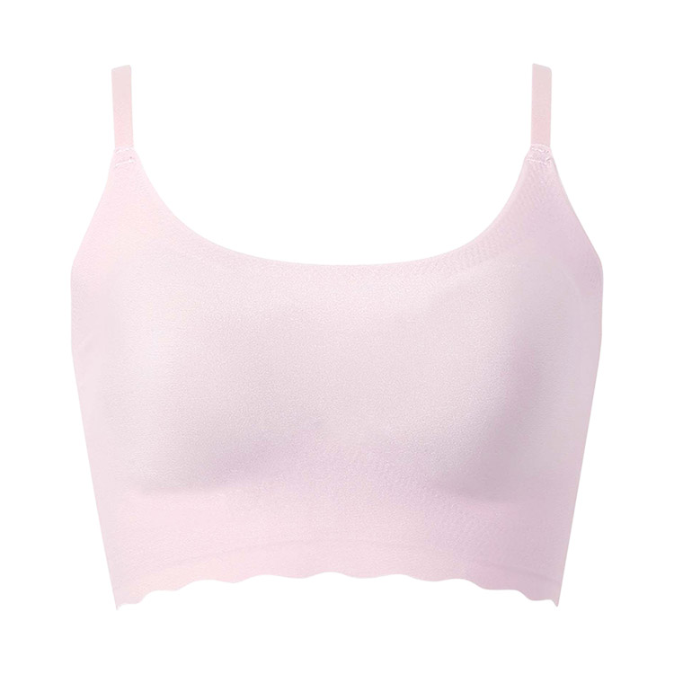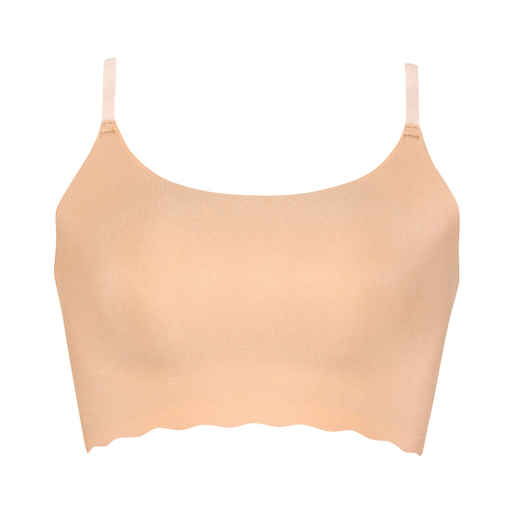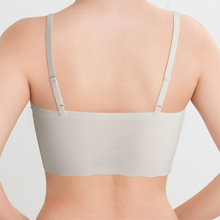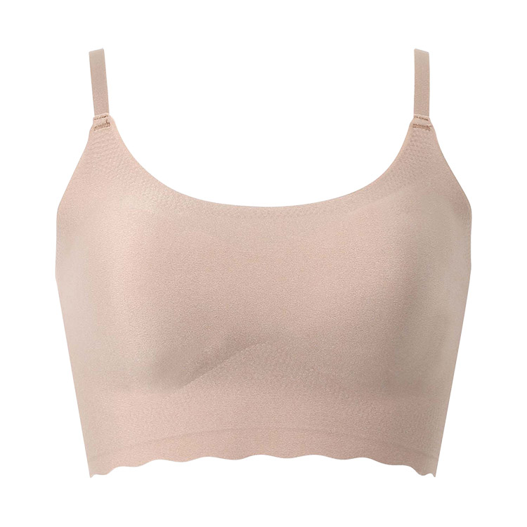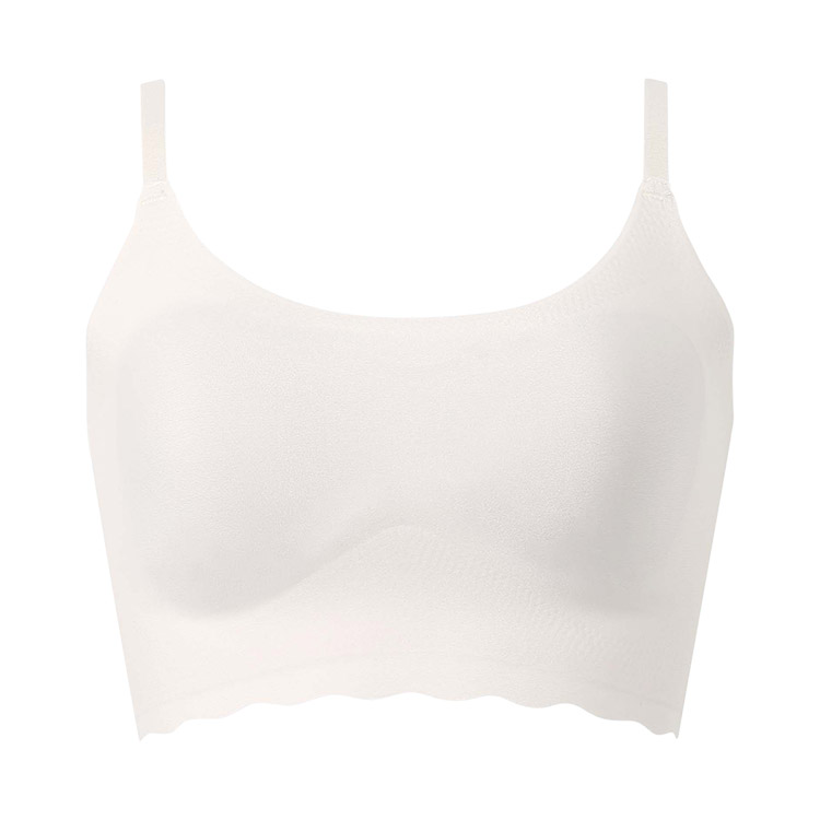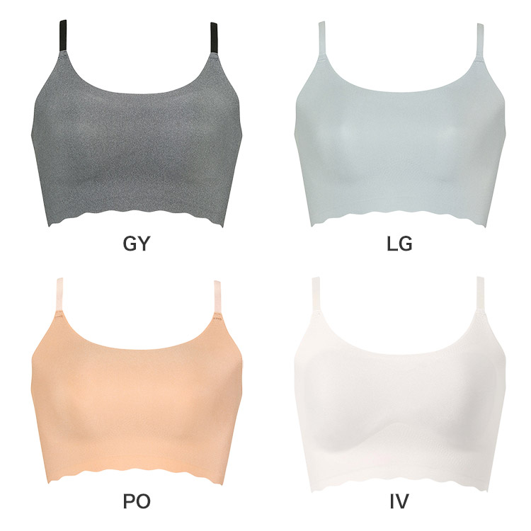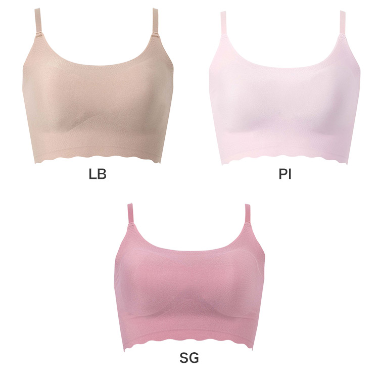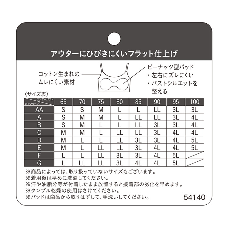 立体感と厚みのある左右一体型のピーナッツ型パッド内蔵(取りはずし可能)で、上向きで立体的なバストシルエットでありながら、バストトップ間隔が離れず位置が安定 ・取扱い表示は本体素材にプリントしているから、肌あたりがやさしい