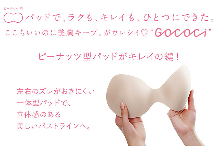 立体感と厚みのある左右一体型のピーナッツ型パッド内蔵(取りはずし可能)で、上向きで立体的なバストシルエットでありながら、バストトップ間隔が離れず位置が安定