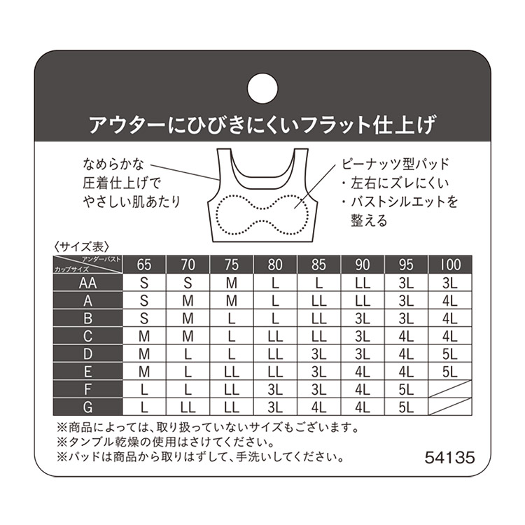S(バスト72-80cm)、M(バスト79-87cm)、L(バスト86-94cm)、LL(バスト93-101cm)