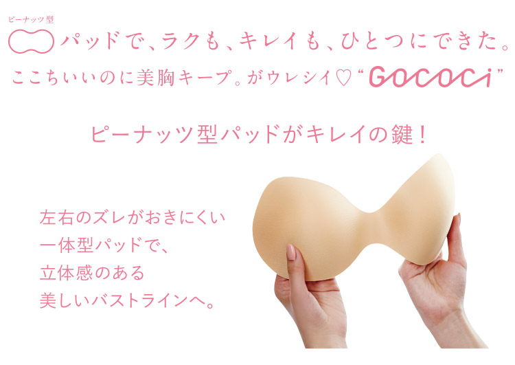 立体感と厚みのある左右一体型のピーナッツ型パッド(ねこ耳タイプ)内蔵(取りはずし可能)で、上向きで立体的なバストシルエットでありながら、バストトップ間隔が離れず位置が安定。パッドの上辺が上胸に沿いやすいラインで、横胸のシルエットがきれい