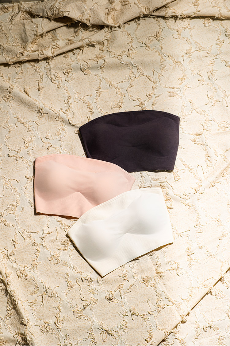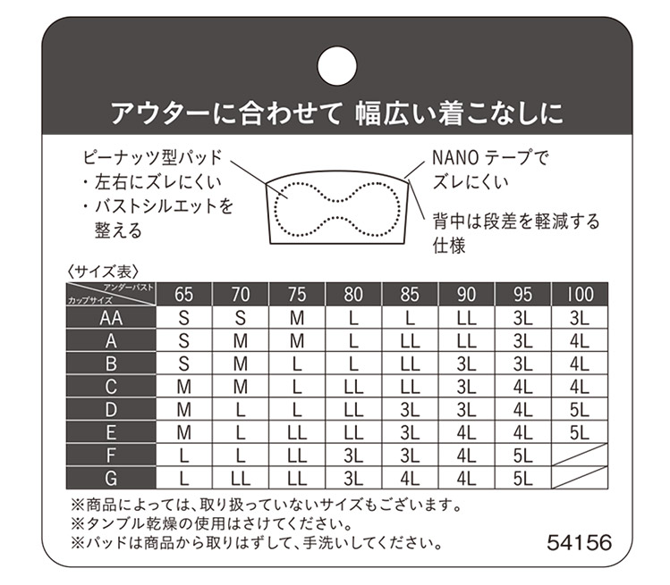 すべりにくくソフトな肌ざわりの超極細繊維を使用した「NANOテープ」を背中上辺にあしらうことでズレにくい。しっかり覆う脇高設計なのでバストが安定しやすい