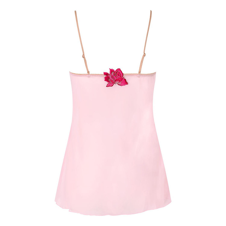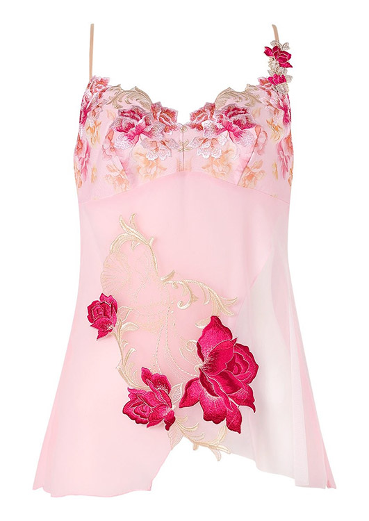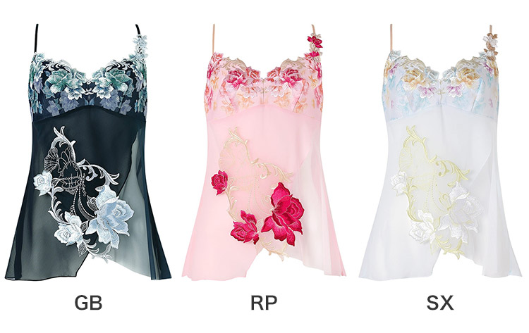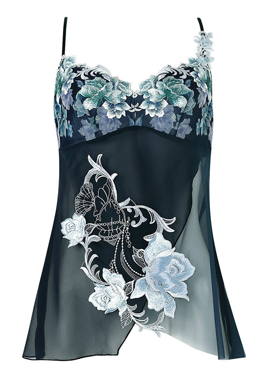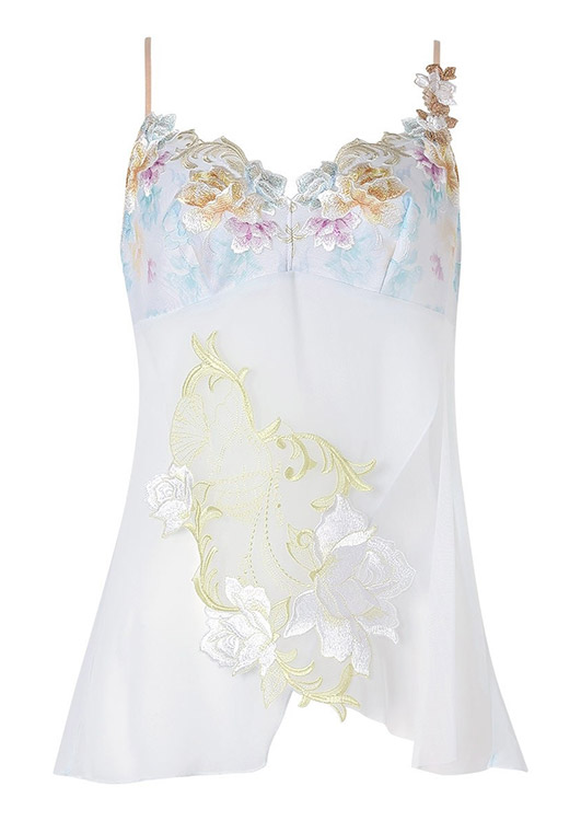 優美なキャミソールをまとって、まるで絵画の世界に入りこんだ気分に。重なり合うチュールの透け感がロマンティック。フロントに神秘的な美しさをもつアルバローズの花をイメージしたアップリケを大胆にあしらいました。色彩豊かな胸もとのレースを引き立てる優雅なデザインです。心華やぐ鮮やかなカラーが日々に彩りをプラスするアイテム。