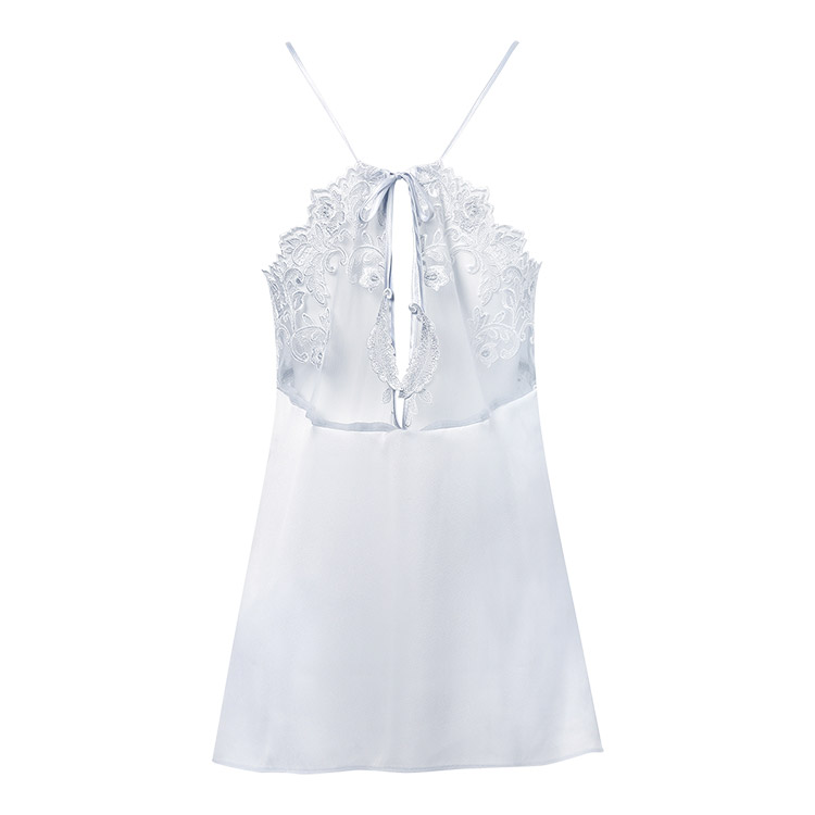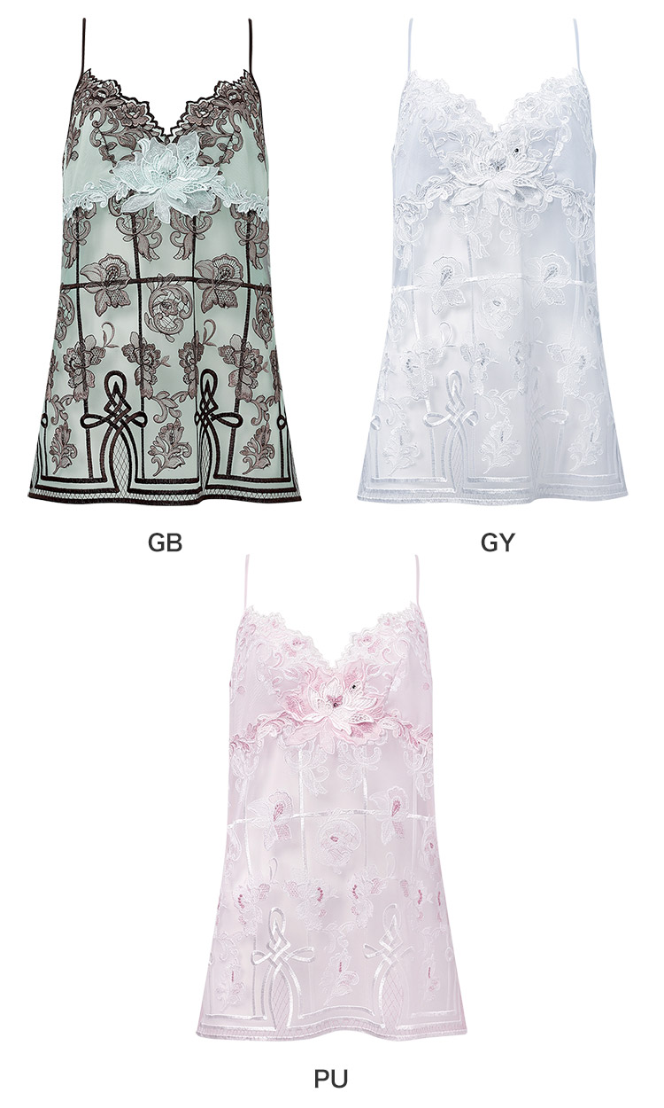 神秘的な美しさを表現した特別感のあるキャミソール。透け感のあるレースは古代ギリシアの建築にインスパイアされたデザインです。胸もとの中心にはアカンサス文様をあしらったバラのアップリケを大胆に飾り、花びらにはスワロフスキー・クリスタルでキラキラと輝きを添えました。首もとで結んだ華奢なリボンの先で揺れる繊細な2枚の羽根モチーフがアクセントに。肌に浮き立つ華やかなレースの美しさにうっとりするような、ディテールにこだわったラグジュアリーな一枚です。