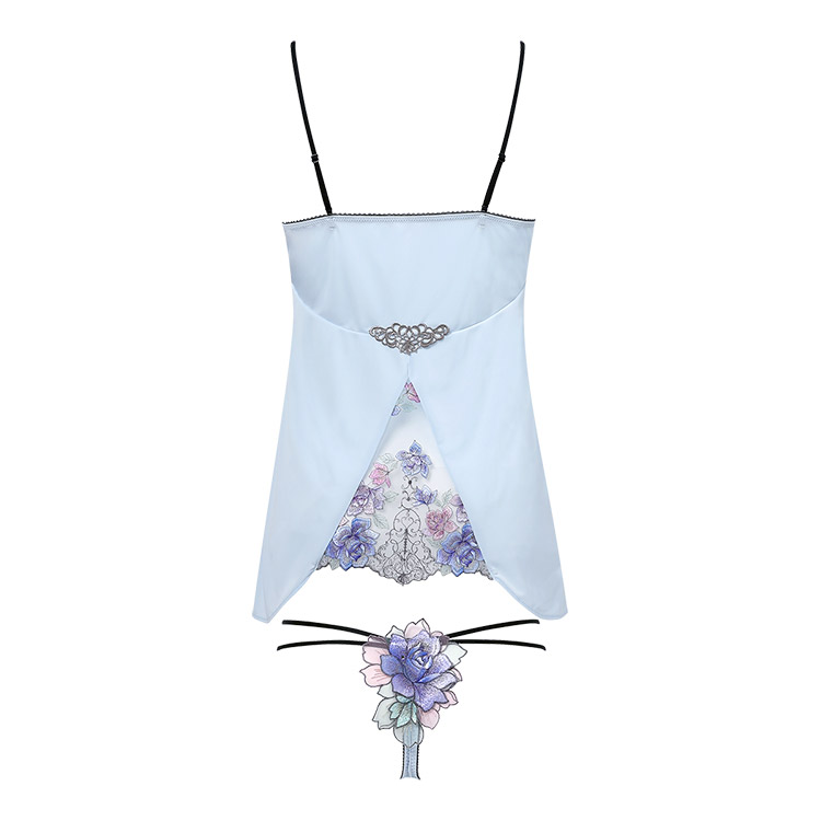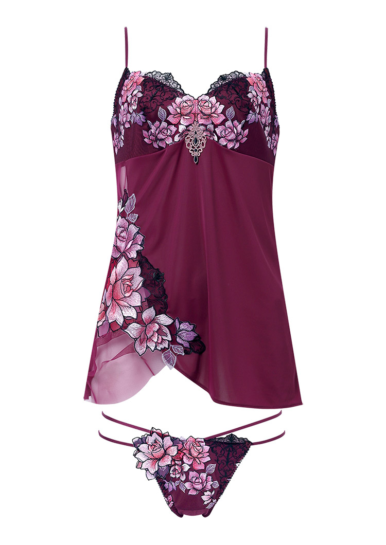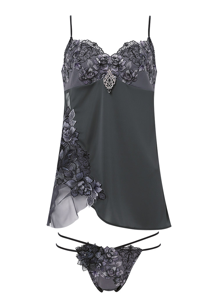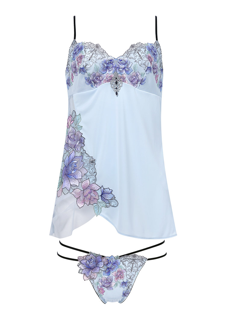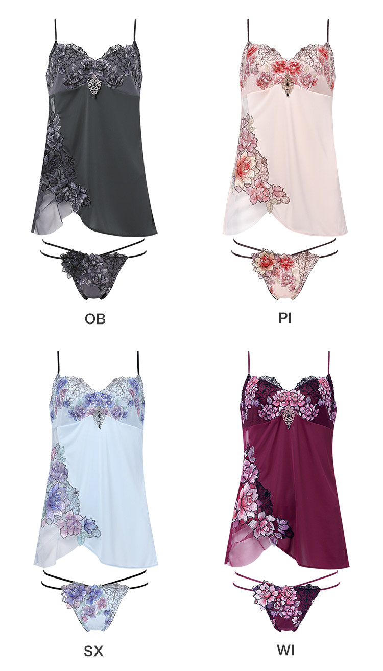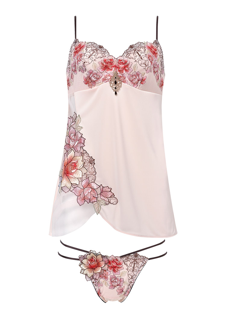咲き誇る花々の芳しい香りに染まりそう。まとうようにあしらわれたバラが華やかなキャミソールと華奢なループ使いがセクシーなTバックショーツのセットアップ。Tバックショーツのバックに飾られた存在感を放つアップリケには、スワロフスキー・クリスタルできらめきを添えました。キャミソールの上品な透け感とのコンビネーションに心躍るデザインです。
