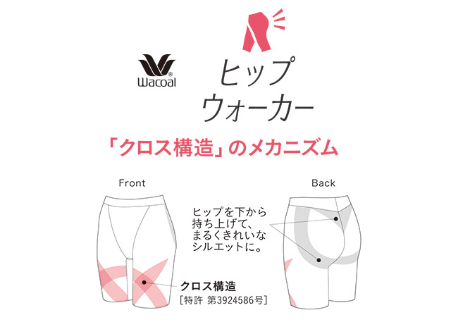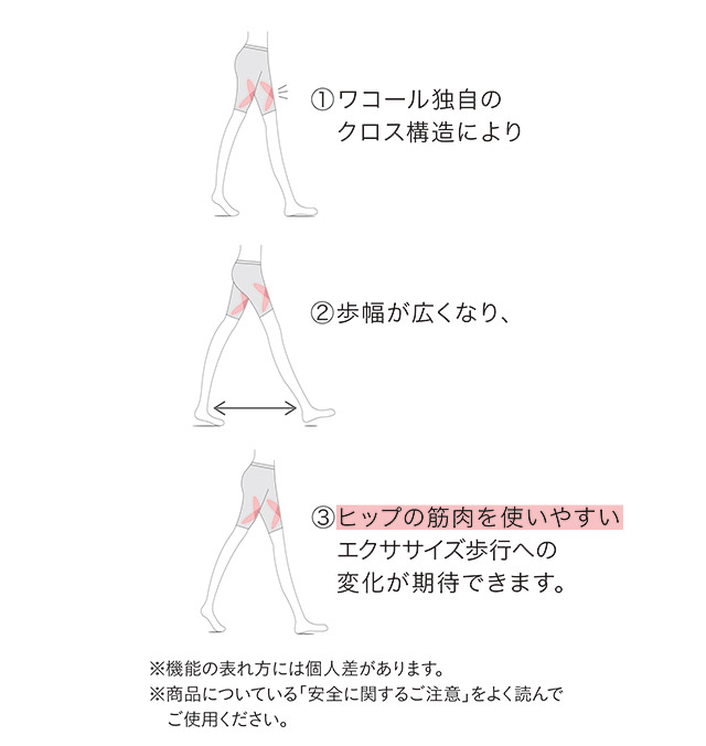 ・ワコール独自のクロス構造[特許 第3924586号][意匠登録 第1278371号]により、歩幅が広くなり、ヒップの筋肉を使いやすいエクササイズ歩行への変化が期待できる