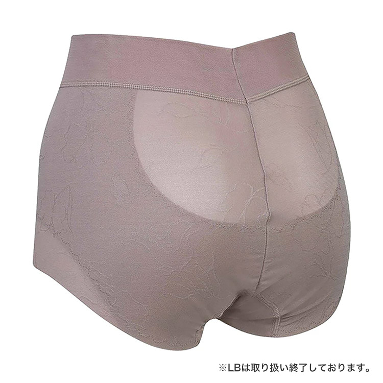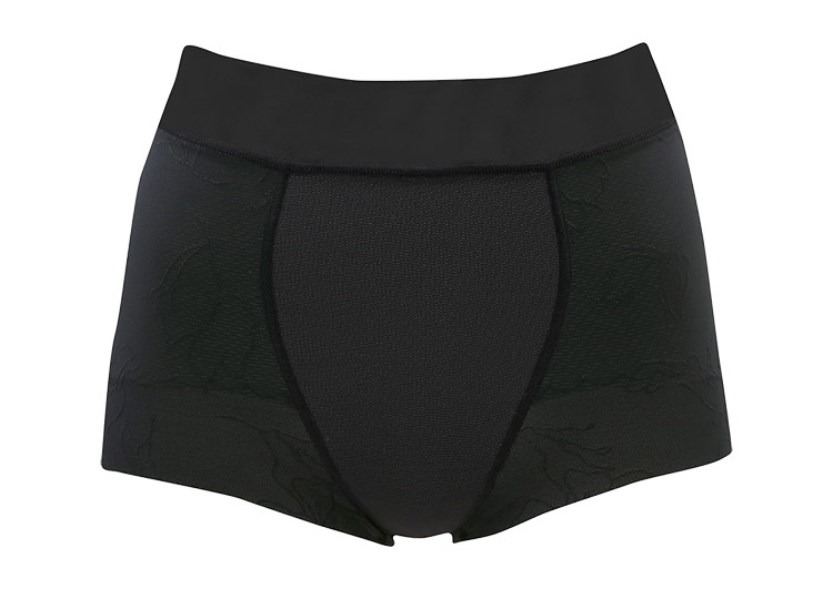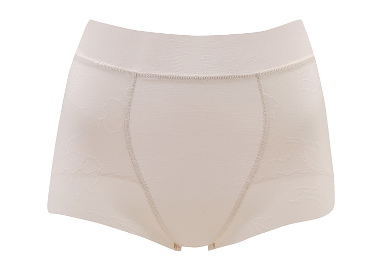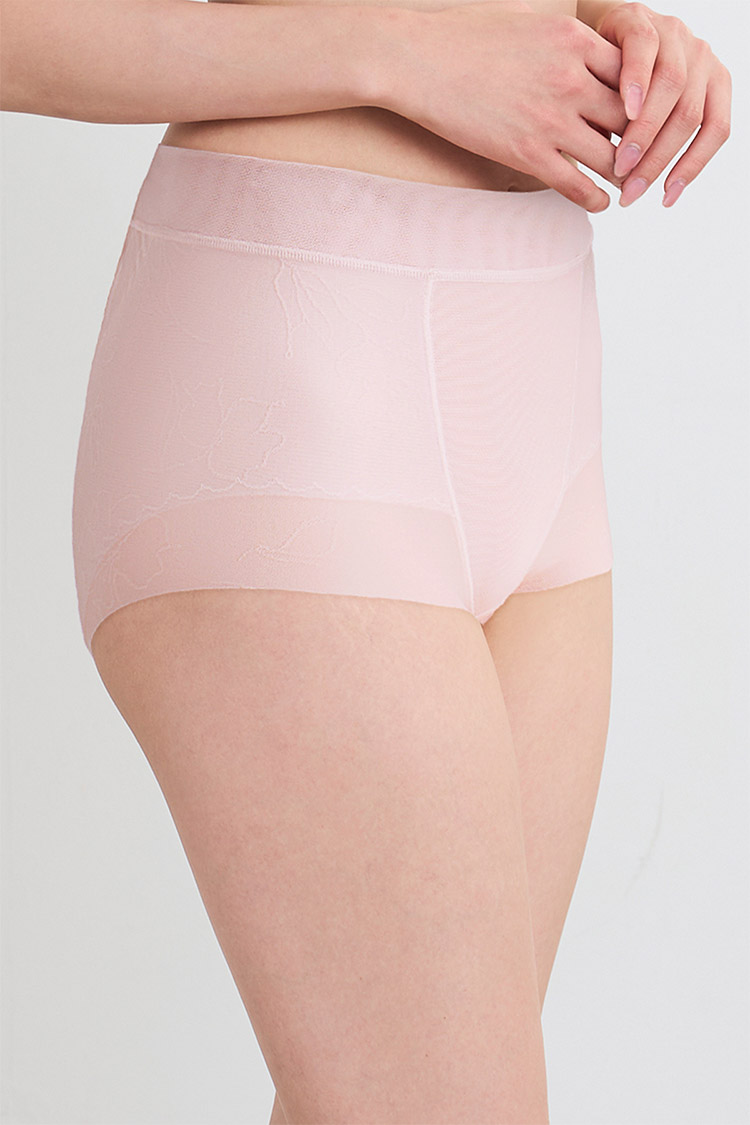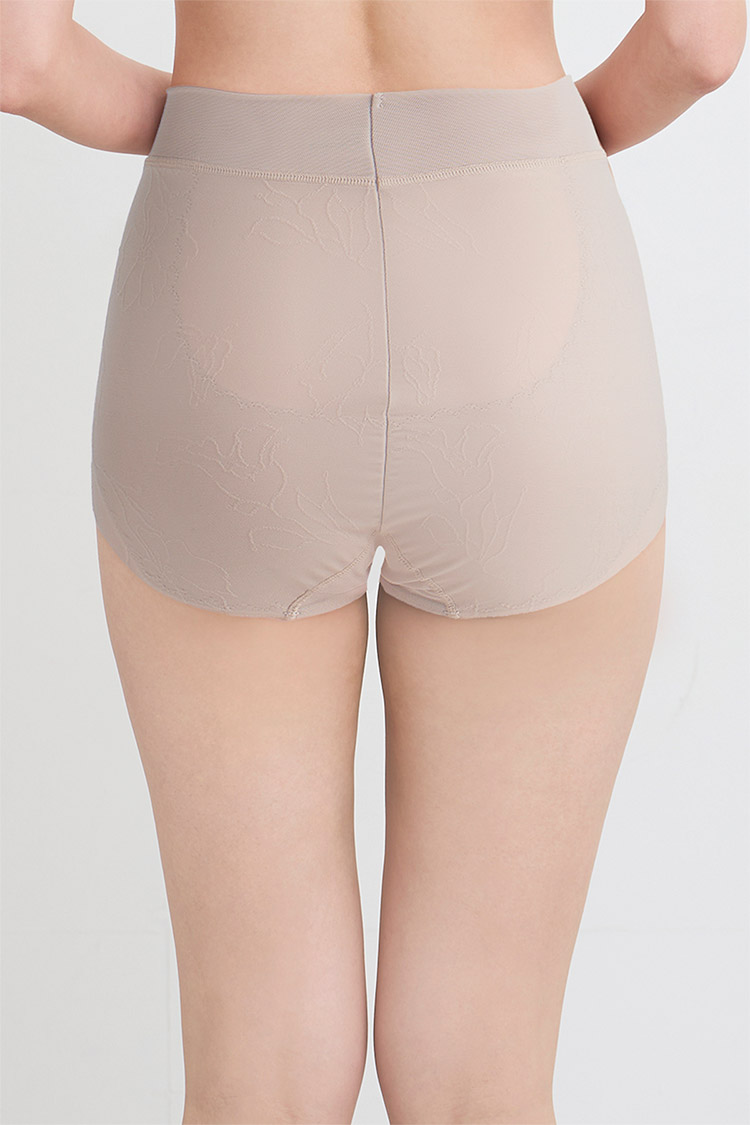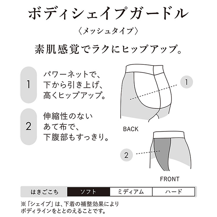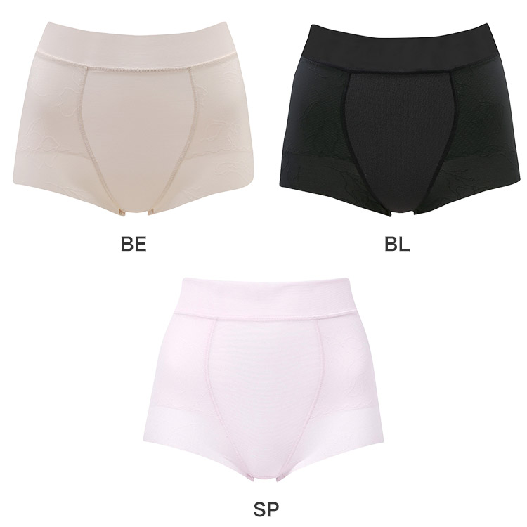通気性のよいパワーネットの裏打ちで、下から引き上げ、高くヒップアップ。伸縮性のない裏打ち生地で、おなかを押さえて、下腹部もすっきり