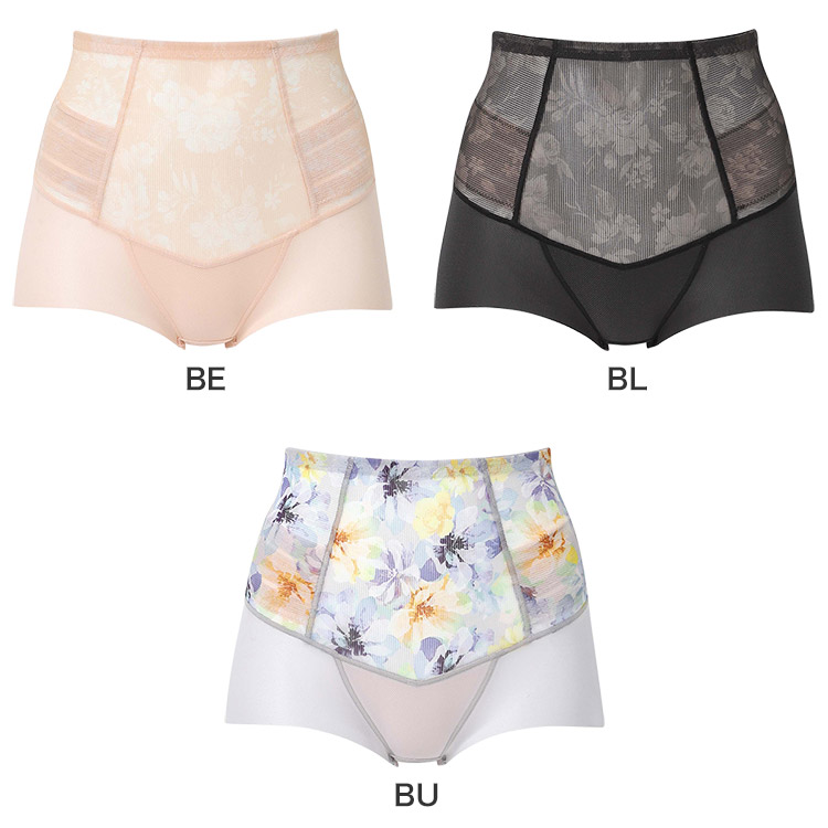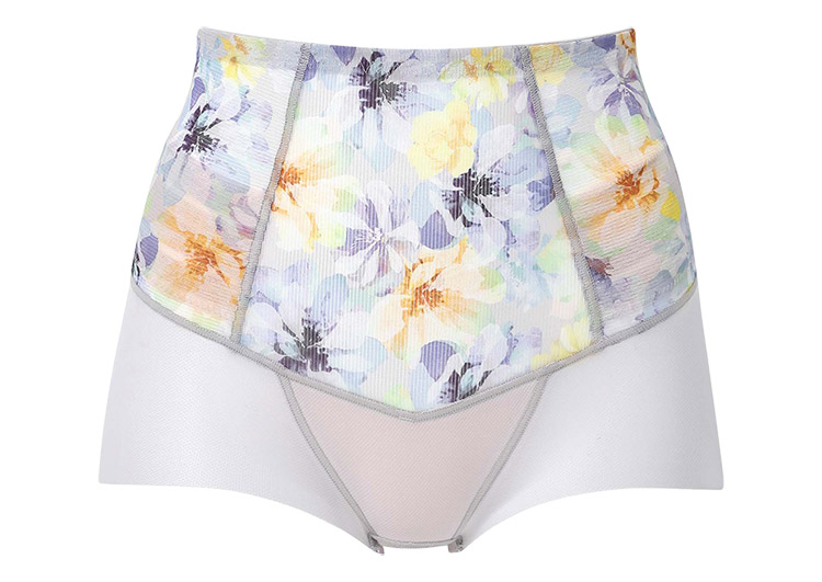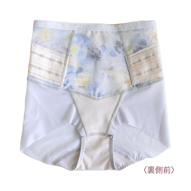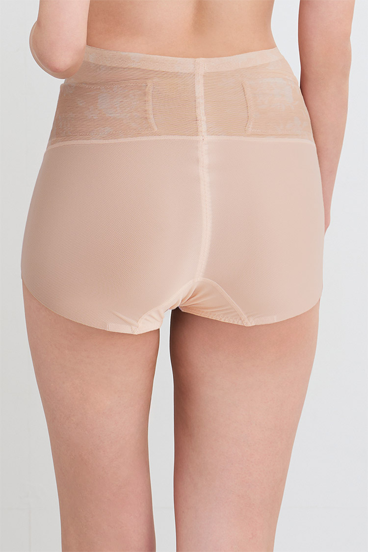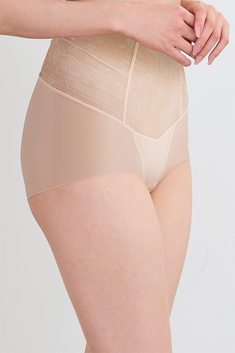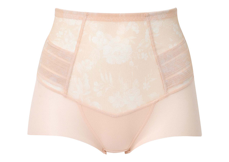 はきこみ丈を通常のジャストウエストより高めの丈にすることで、おなか・ヒップのリフトアップ効果を高め、よりスリムなシルエットを追求。さらにヒップ下はパワー切り替えのない素材で、たるみをぴったり包み、美しいシルエットをキープ