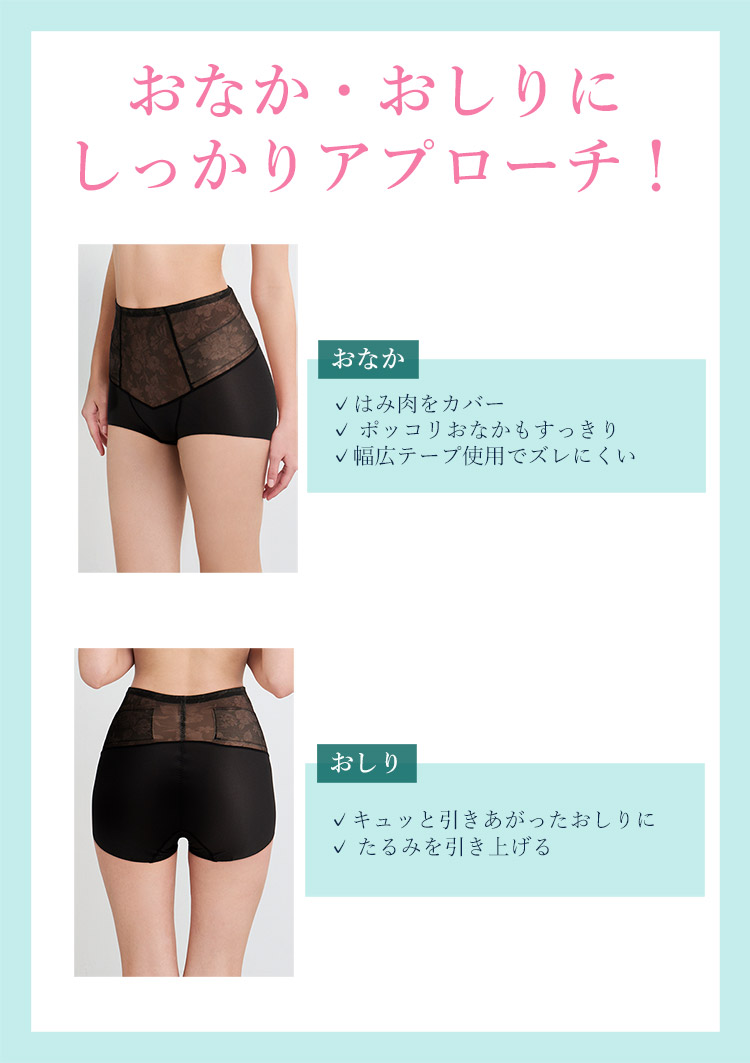 その際引き上げすぎないことと、通常行う「手直し」(着用後、ボトムの中に手を入れてととのえること)をしないようにお願いします(手直しするとリフトアップ効果が薄れます)