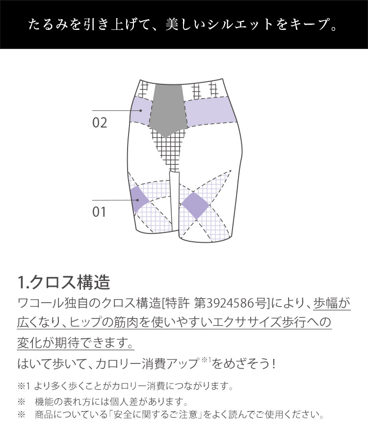 ・ワコール独自のクロス構造[特許 第3924586号][意匠登録 第1278371号]により、歩幅が広くなり、ヒップの筋肉を使いやすいエクササイズ歩行への変化が期待できる。