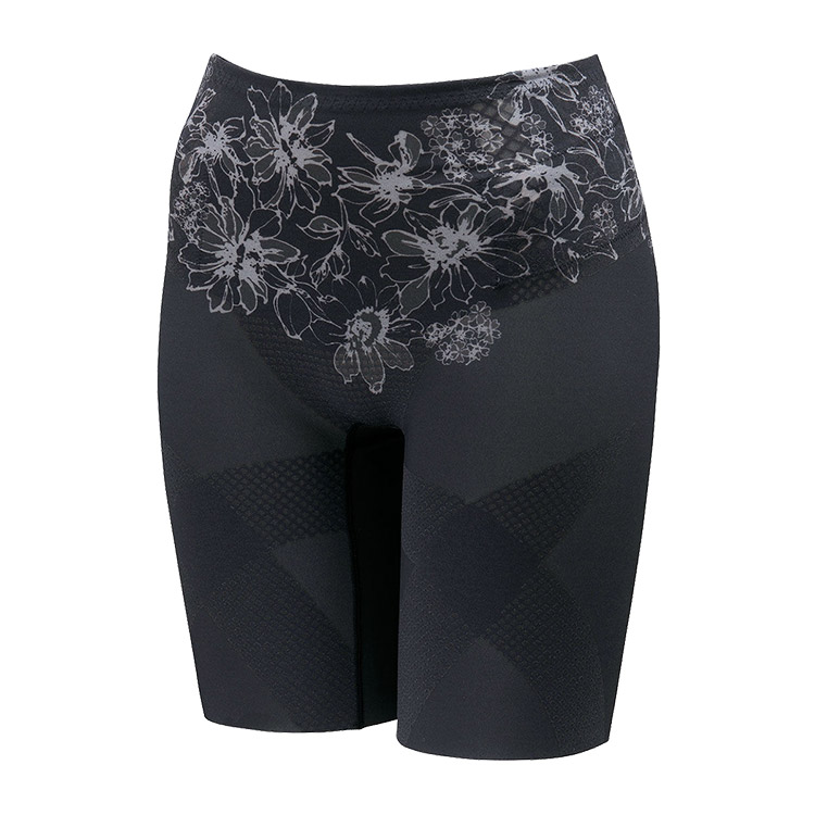 ・“すべりにくい”“ソフトな肌ざわり”という特徴をもつ超極細繊維を使用した「NANOテープ」[特許 第5296901号]で、気になる下半身の“たるみ”を下からググッと引き上げ、スリムなシルエットを追求する[特許 第5971572号](肌リフト構造)