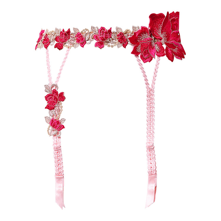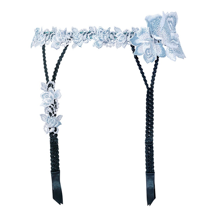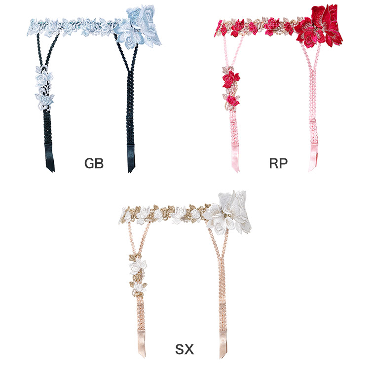 上品な花々がウエストを彩るロマンティックなガーターベルト。贅沢に飾られたレースをまとい、まるで絵画の世界に入りこんだような気分に。神秘的な美しさをもつアルバローズをイメージしたアップリケにはきらめくクリスタルをあしらいました。片方のストラップにほどこしたアップリケがワンポイント。コーディネイトに花を添えるゴージャスなアイテムです。