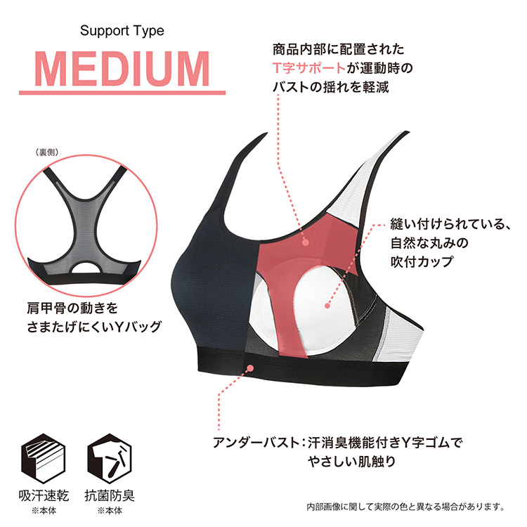 高校生の成長期のデリケートなバストを、やさしくサポートするT字サポート機能。カップ内蔵のT字のパワーネットがバストトップを通る設計で、運動時のバストのユレを軽減。押さえずにやさしく支えます