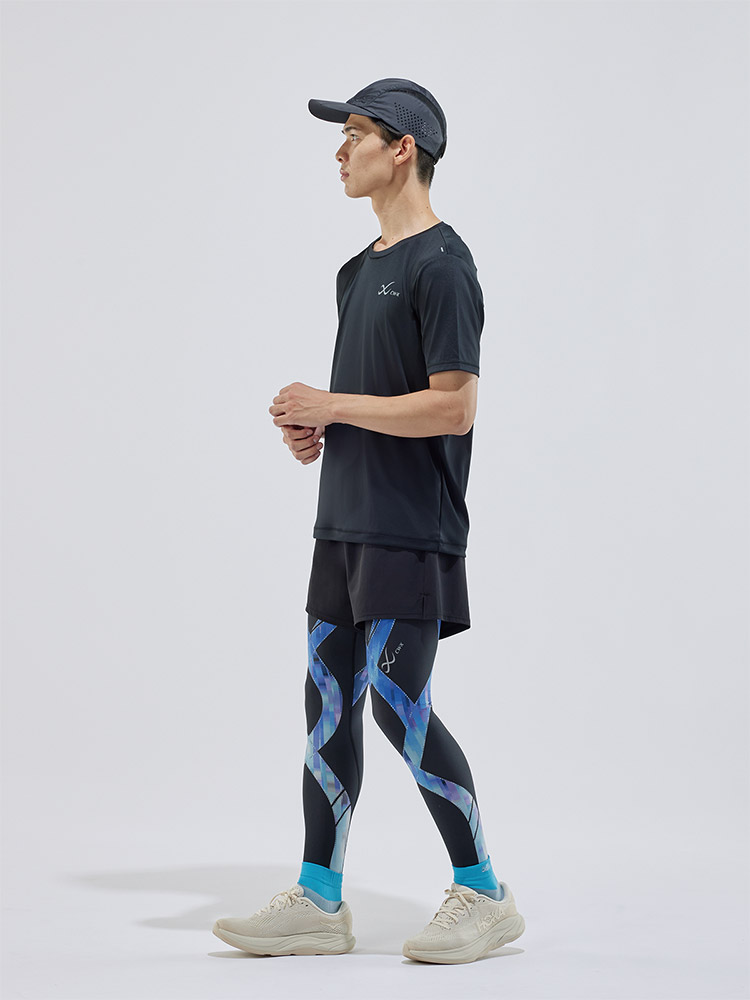 ●CW-X独自のテーピング原理で着地時の衝撃からひざを守る。サポートラインが筋肉のムダな動きを抑え、運動時の筋肉の疲労軽減が期待できます