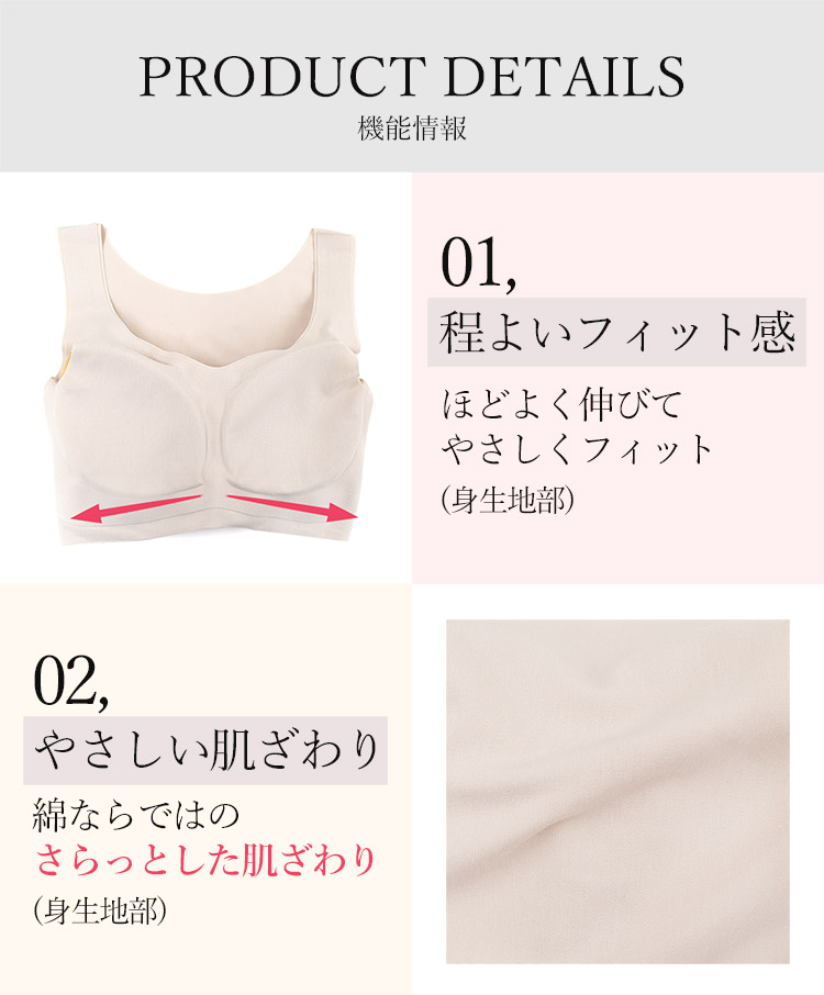 バストも肩も背中も、やさしい解放感に包まれながら、きちんときれいをキープできる、機能性のある綿混素材のらくちんハーフトップ。