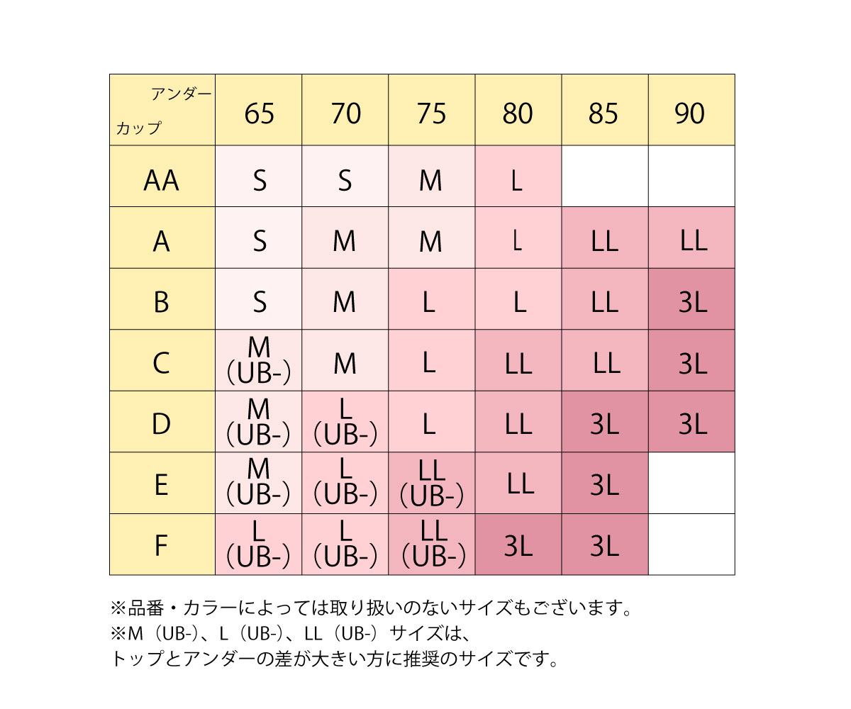 ※M(UB-)、L(UB-)、LL(UB-)サイズは、トップとアンダーの差が大きい方に推奨のサイズです。
