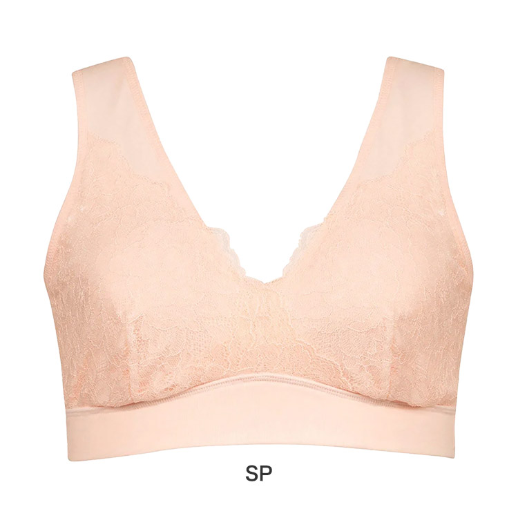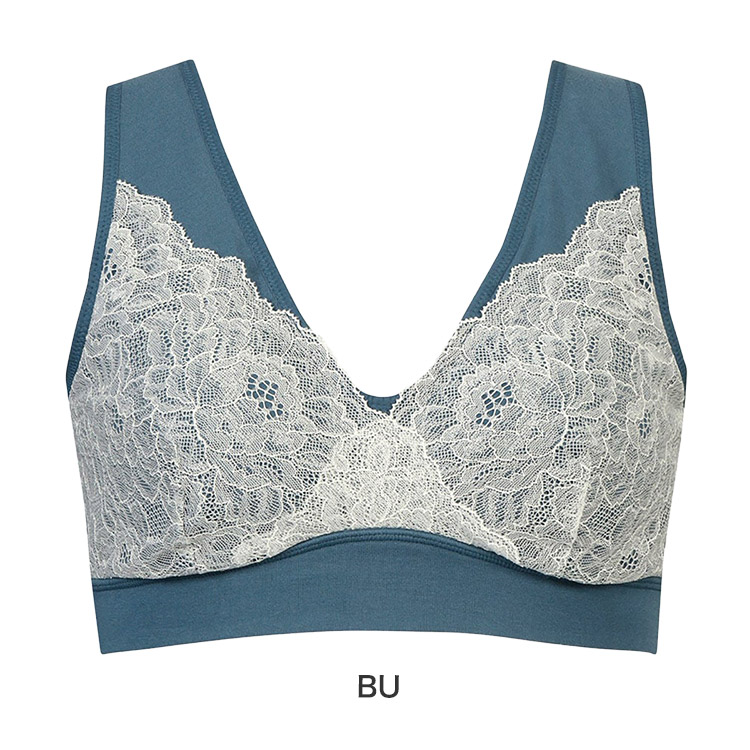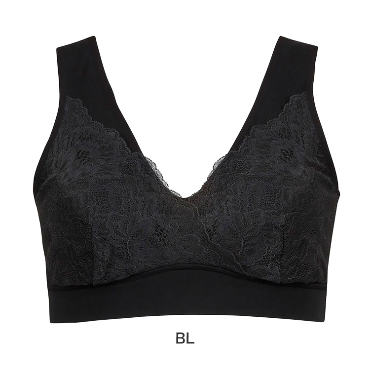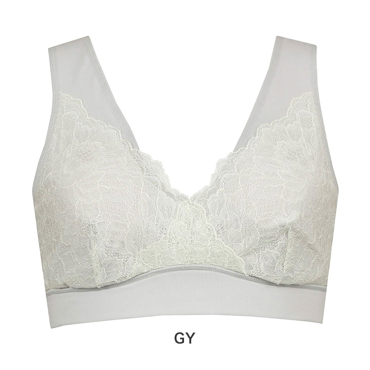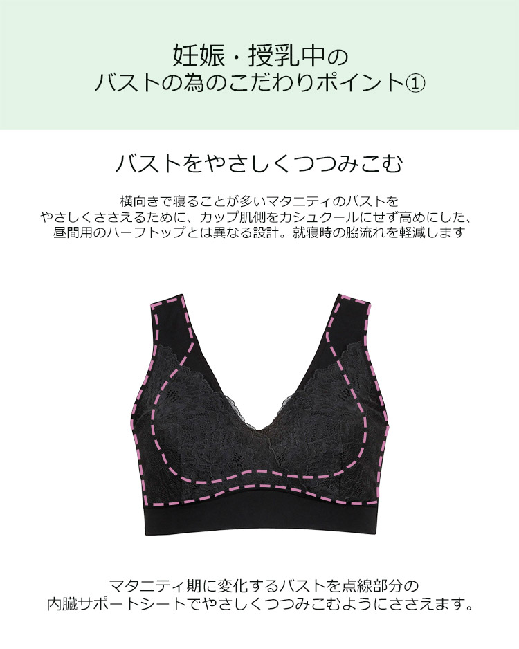 カップ肌側布の前中心を高めにした、昼間用のハーフトップとは異なる設計で、就寝中の脇流れを軽減