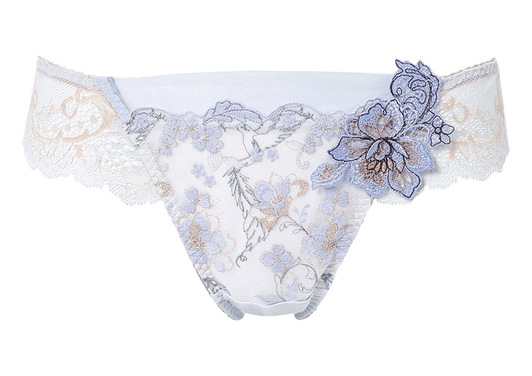 ブラ(PB4010)シリーズとのペアコーデが楽しめる、華やかなTバックショーツ。幸運のお守りのように、幸せや飛躍を象徴する羽や鳥モチーフを、刺繍レースにしのばせた特別感あふれるデザイン。アウターにひびきにくいTバックショーツを、気持ちを高めるポジティブな華やぎとともに楽しめます。