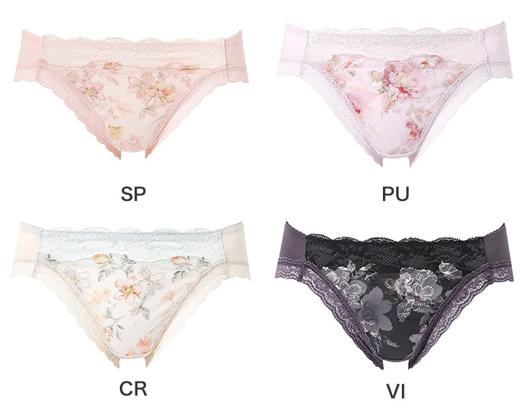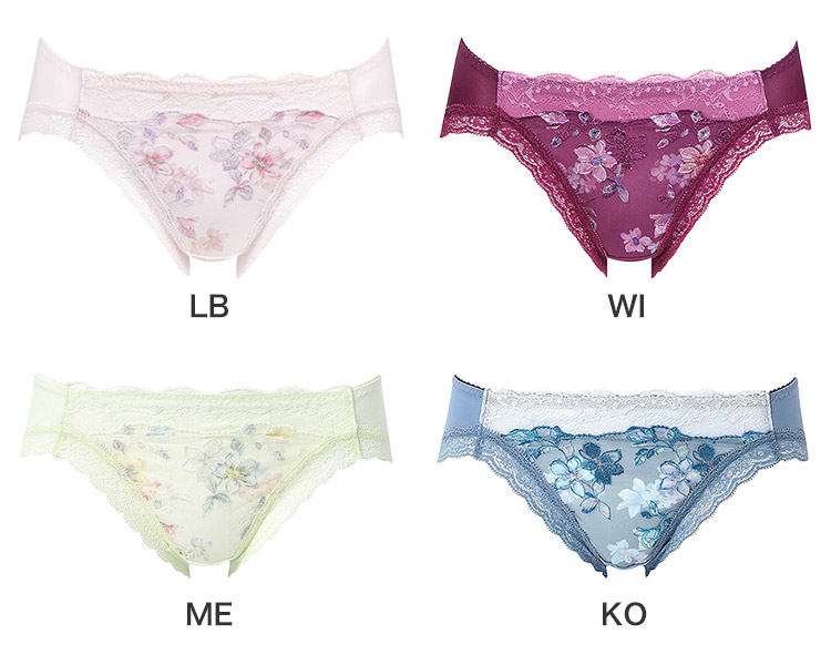 「小さく見せるブラ(BRB453)」とペアコーデが楽しめるショーツ。あさめのはきこみ丈で、すっきりとした印象です。可憐な花々をモチーフにしたレースが愛らしいロマンティックなデザイン。