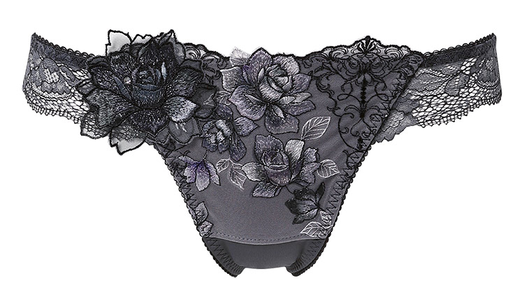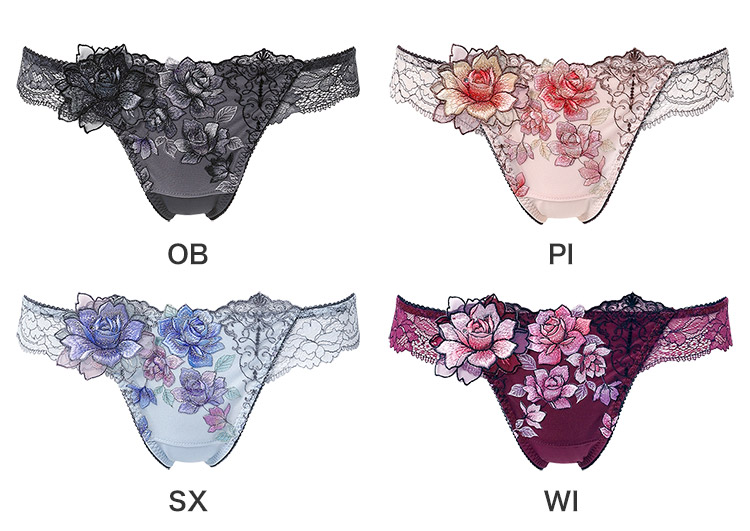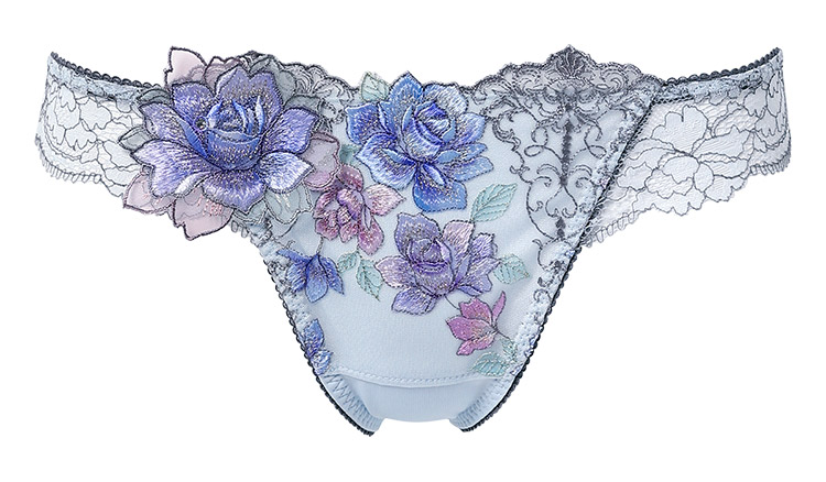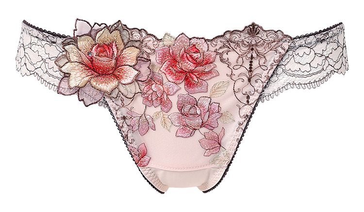 しなやかな曲線と美しい色彩の調和がエレガント。フロントに飾った繊細なグラデーションのアップリケが存在感を放ちます。統一感のあるカラーリングで洗練された印象に。バックはアウターにひびきにくい総レース仕様。バック中心にはクラシカルなアップリケをアクセントにあしらいました。オリエンタルなムードをまとった優美なレースと透け感のコントラストが楽しめるデザインです。