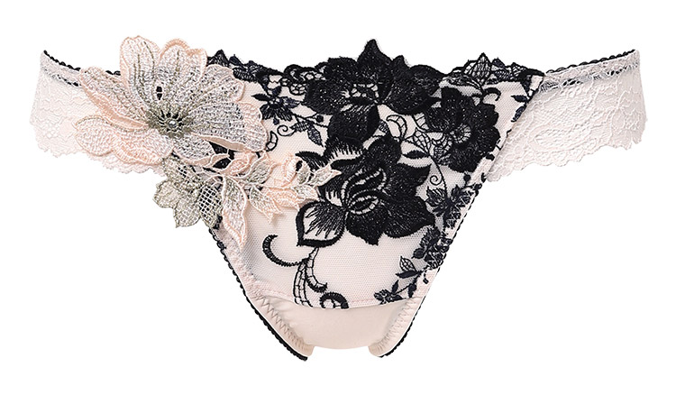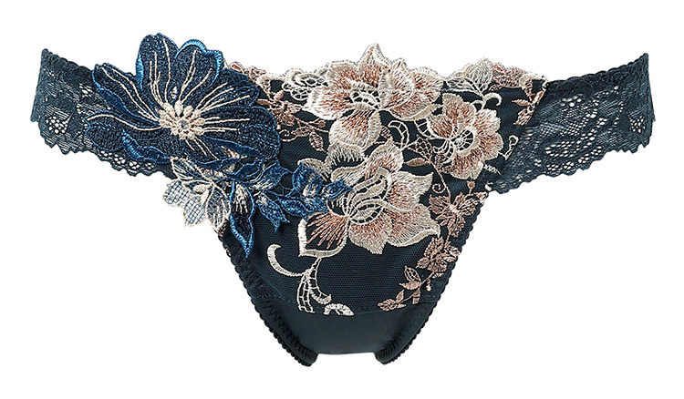 はっきりとした輪郭で表現された花々と、芍薬の花をイメージしたアップリケがゴージャス。ドラマティックなカラーリングが魅力を際立たせます。花びらの上で輝く繊細なクリスタルと、フロントにきらめきを与えるラメ糸が豪華さを演出。バックにほどこされたクロスデザインがセクシーさを引き立たせるアクセントに。